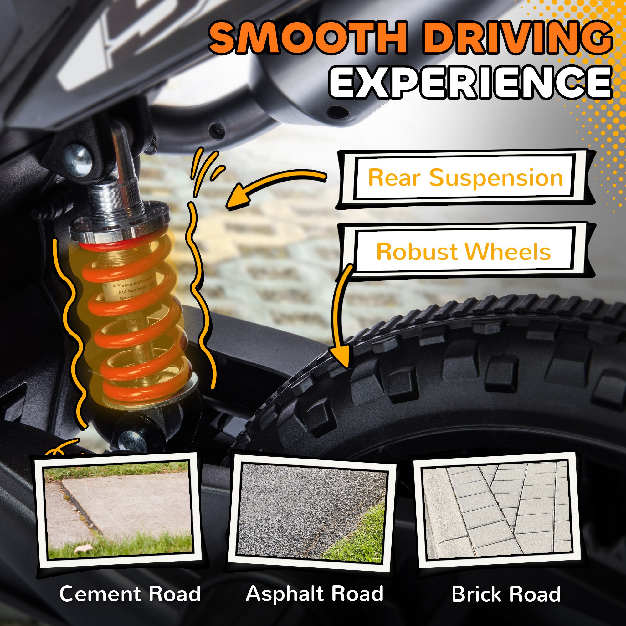Elevate playtime with the AIYAPLAY kids electric motorbike! This officially licensed Aprilia boasts a sporty and stylish look. Great for ages 3-8 years, it comes with removable training wheels for beginners. Equipped with two 12V motors, it offers up to an hour of fun at a speed of 6km/h. With LED lights, a USB port and music, it enhances the fun and excitement. Wonderful for young thrill-seekers, it's sure to fill their days with joy and laughter.