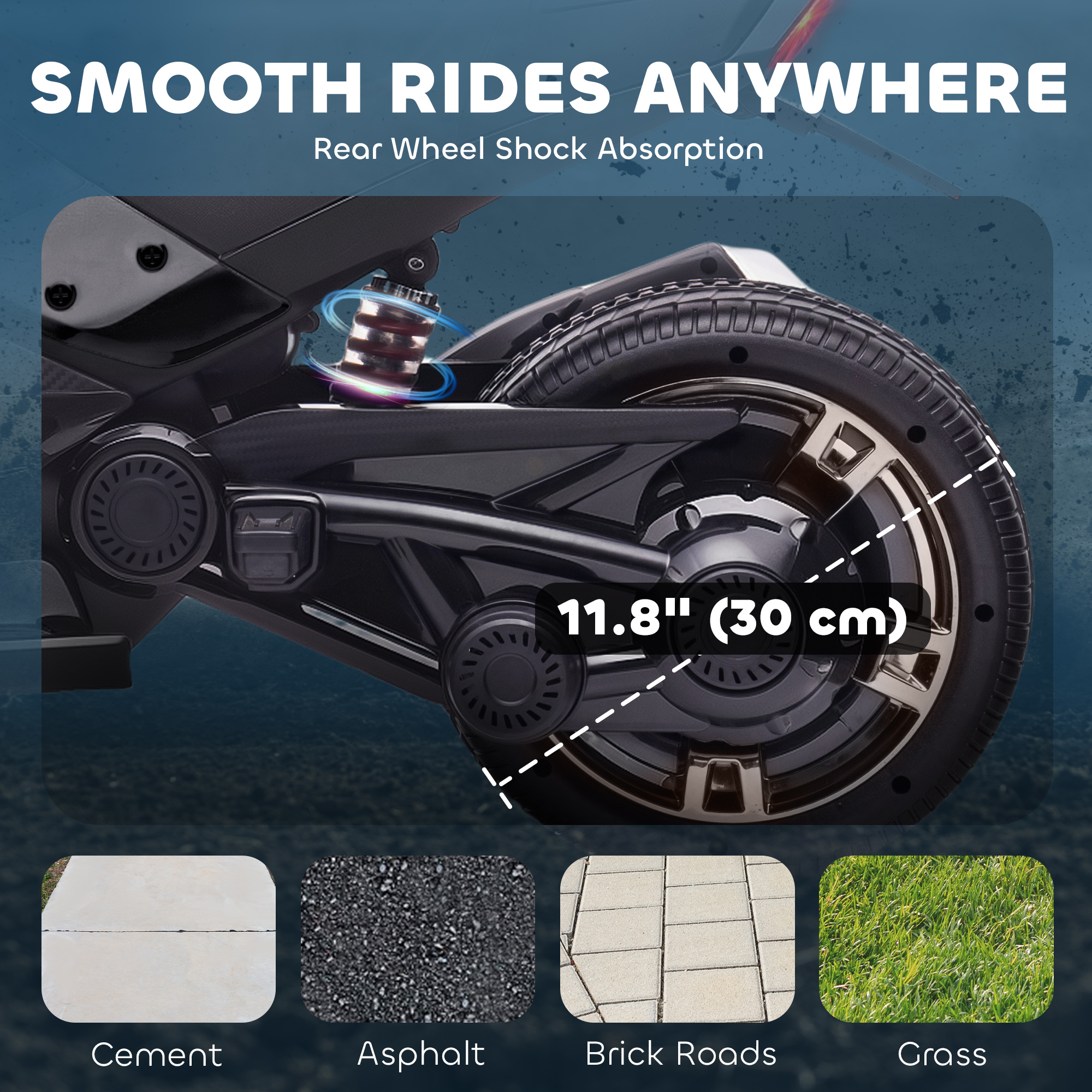 - Two 12V motors and independent suspension rides smoothly on all terrains