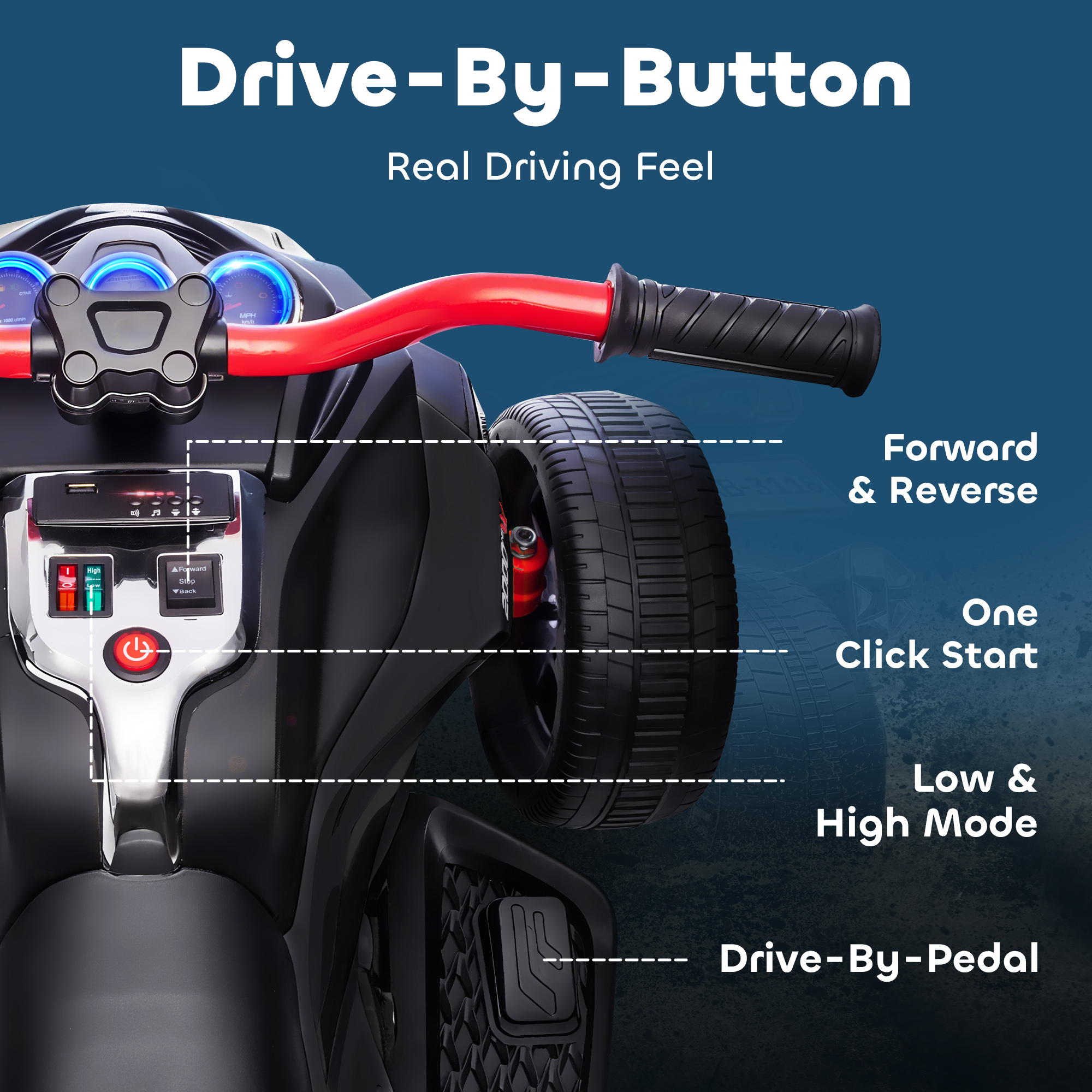 Adventures start with the AIYAPLAY kids electric ride on ATV – a cool reverse trike design that makes kids feel like real explorers. Two 12V motors and suspension keep rides smooth at 3–5km/h. Built-in USB lets them play their favourite songs, while front and rear LED lights light the way for added fun and realism. It's a ride made for excitement, confidence and imagination.