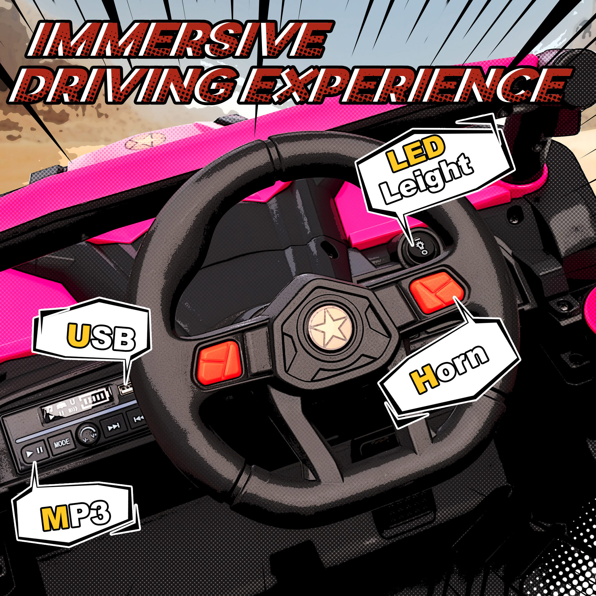 - Working lights, horn and music offer a fun, immersive UTV driving adventure