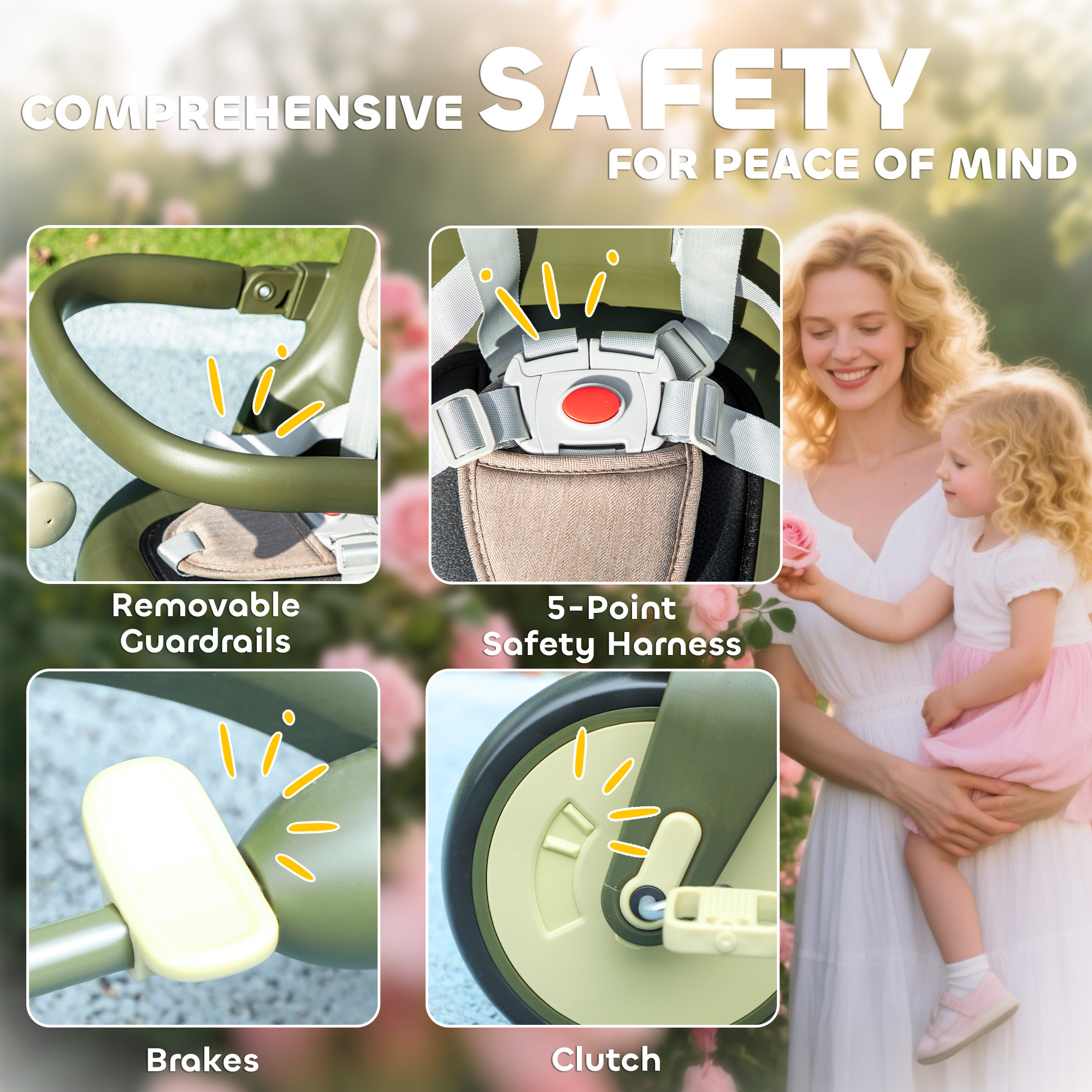 - Five-point harness and removable guardrail keep little ones secure
