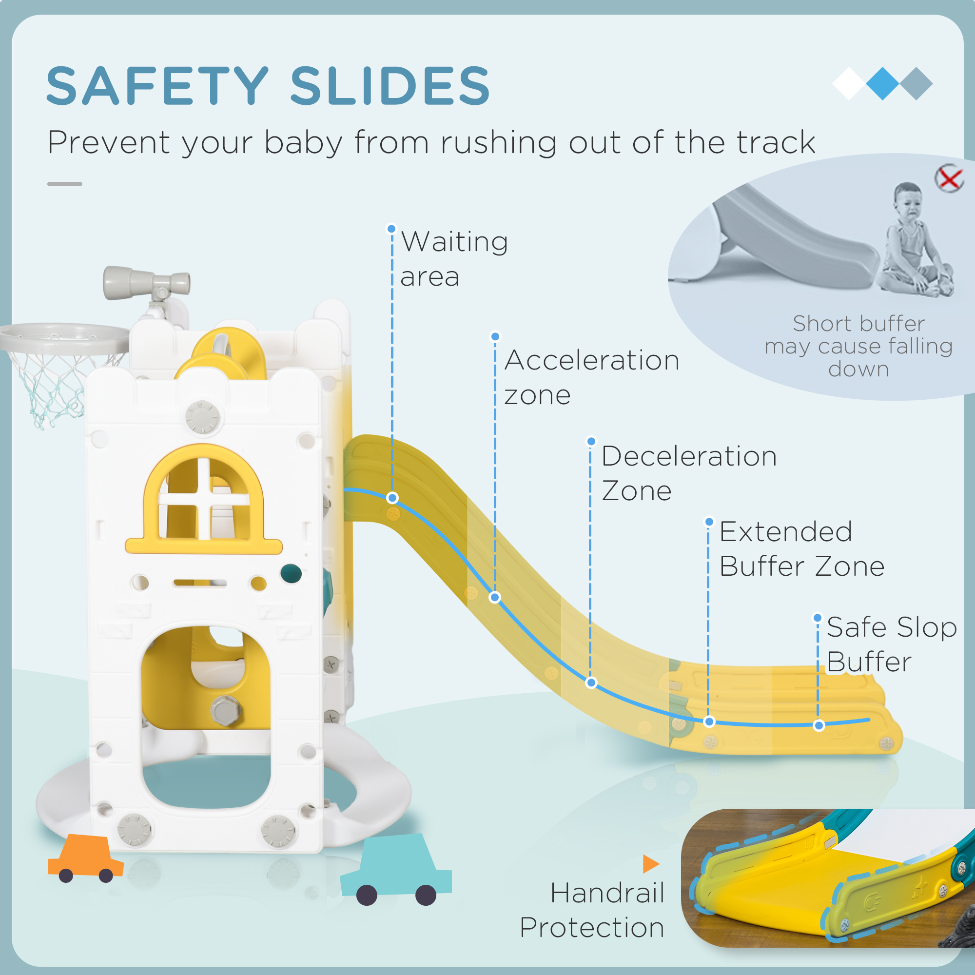 Transform your little adventures' playroom with the AIYAPLAY 6-in-1 Toddler Playground! This vibrant set includes a swing, a slide with specially designed safe zones, a basketball hoop and so on, great for active toddlers aged 1-3. Crafted from smooth, kid-friendly HDPE, it's a delightful way to encourage play and exercise indoors or out.