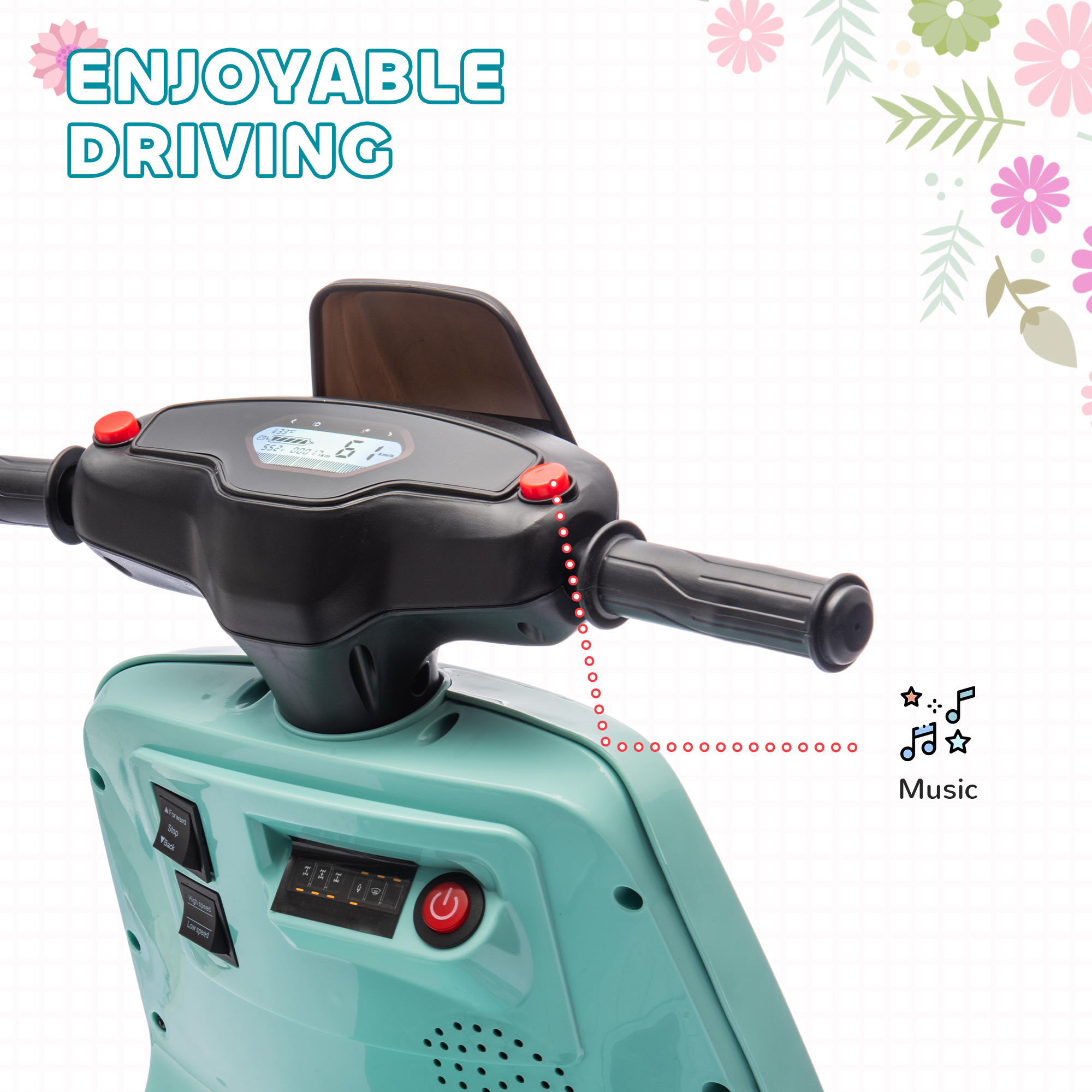 - Headlights and music enhance enjoyment and visibility