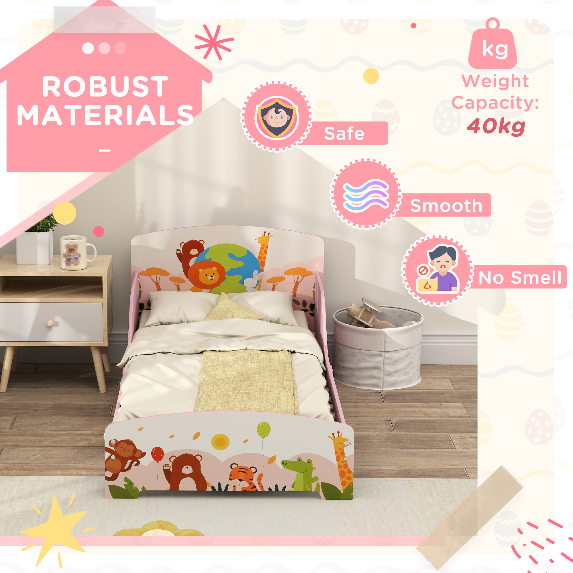 Dream big with the AIYAPLAY single bed for kids, designed with safety rails and high sideboards to keep them safely in bed all night long. Its low height makes getting on and off easy, simplifying the transition from cot to bed. Plus, the cute animal patterns add a vibrant touch to any room, perfectly blending style and function, wonderful for small spaces.