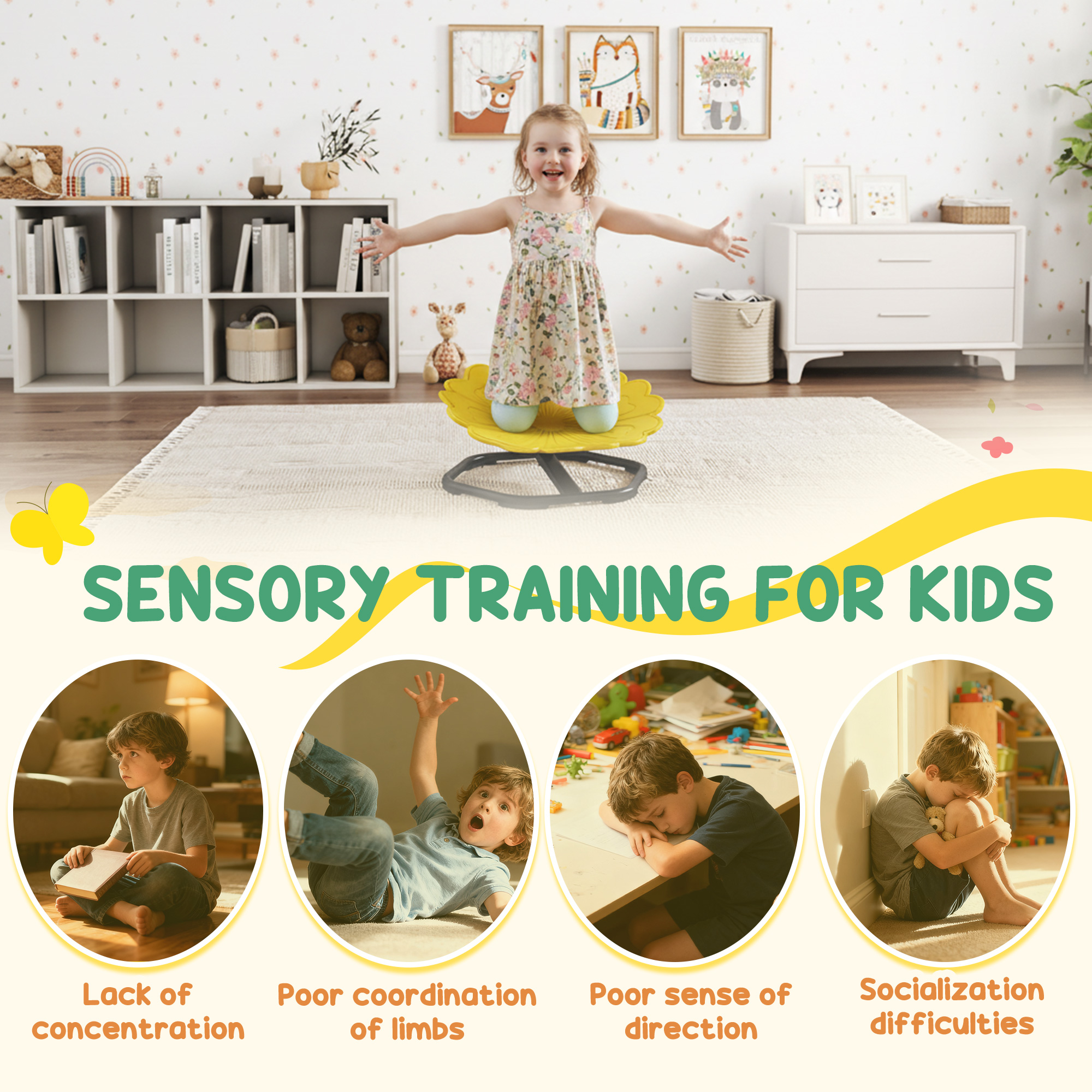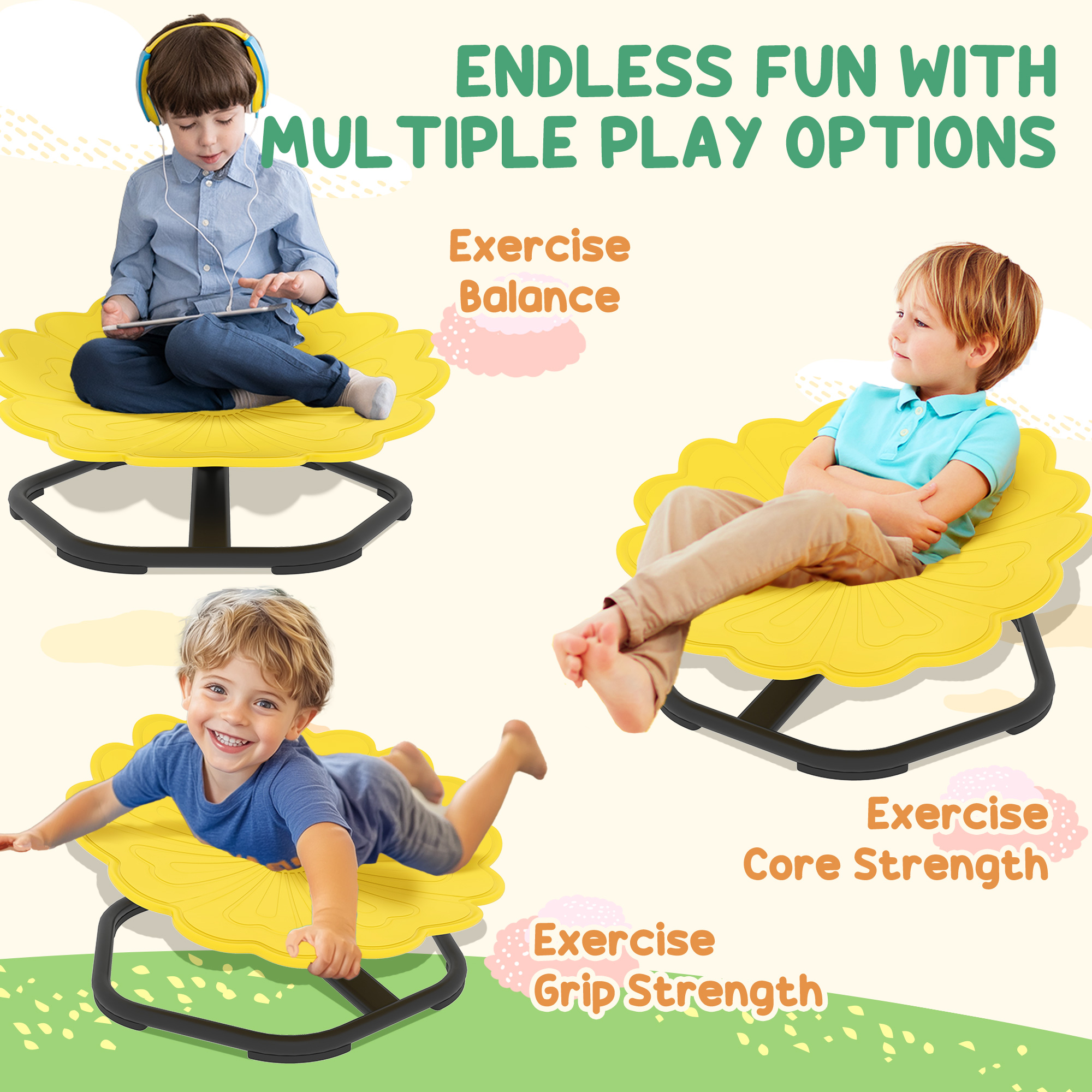 Bring calm and joy to playtime with the AIYAPLAY kids swivel chair. Designed for safe spinning fun, little ones can sit or lie on their tummy as they gently rotate – a playful way to engage imagination and release energy. The thick plastic seat and anti-slip strips keep them secure, while the smooth motion offers calming sensory input – especially helpful for children with additional needs. A fun, therapeutic addition to any playroom.