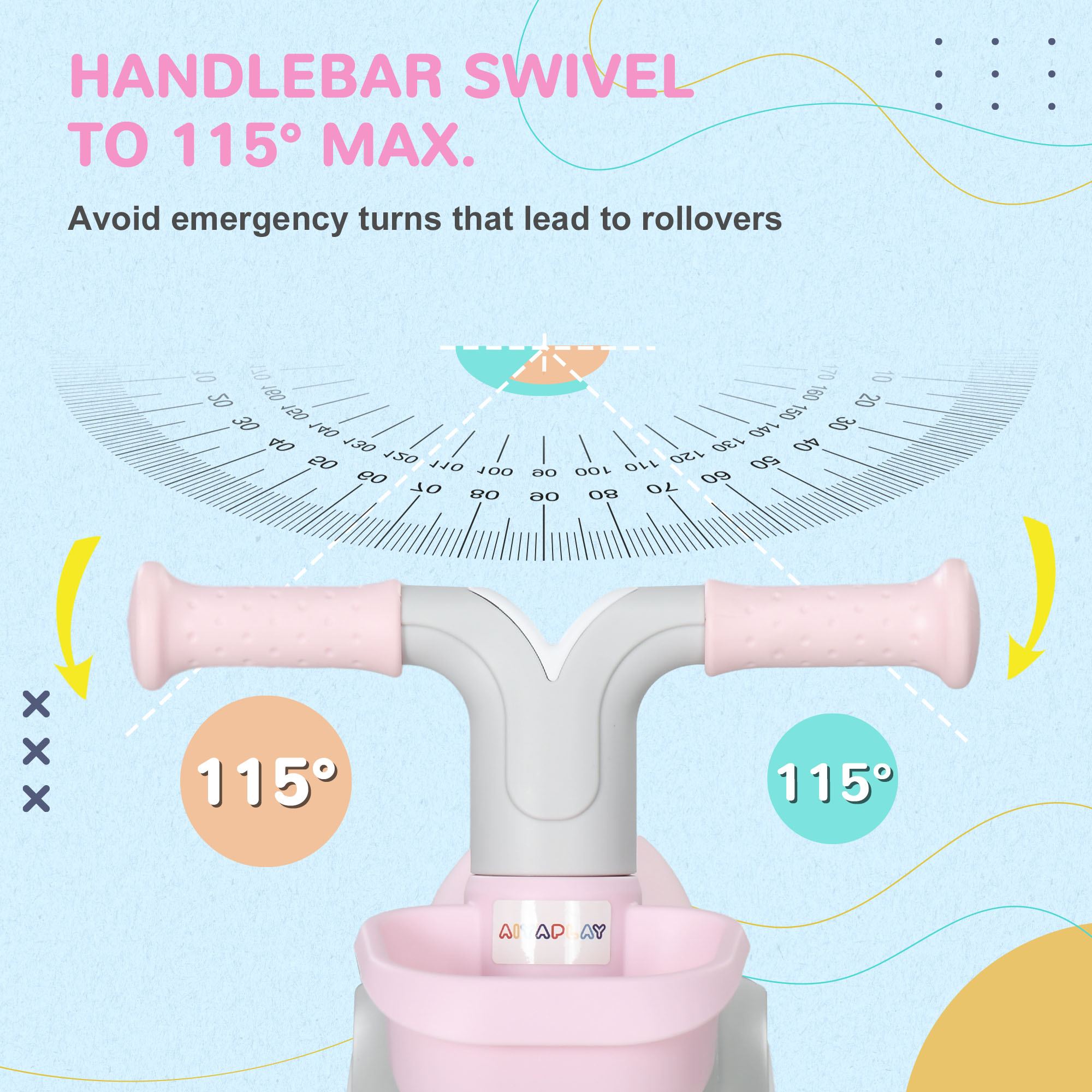 Ready, set, glide! The AIYAPLAY Balance Bike is your toddler's first step to pushing, standing and walking with confidence. With a seat 2-position adjustable 2cm, this kid's bike grows with your child from ages 12–36 months. Enjoy the silence of its indoor-outdoor-friendly tires while the safe design ensures a smooth and secure ride. Removable basket can hold the baby's beloved small toys. Have your little adventurer start their cycling journey today.