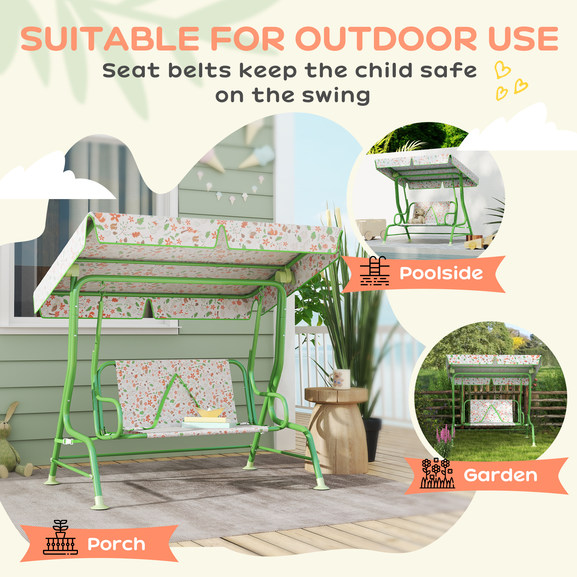 Discover the joy of outdoor relaxation with the AIYAPLAY 2 seater swing. Featuring an adjustable canopy to shield your little ones from the sun, this swing bench is suitable for the garden, poolside, or garden. The stable steel frame with non-skid feet ensures stability and safety, while the charming fox pattern adds a touch of whimsy. Suitable for kids to share a swinging adventure!