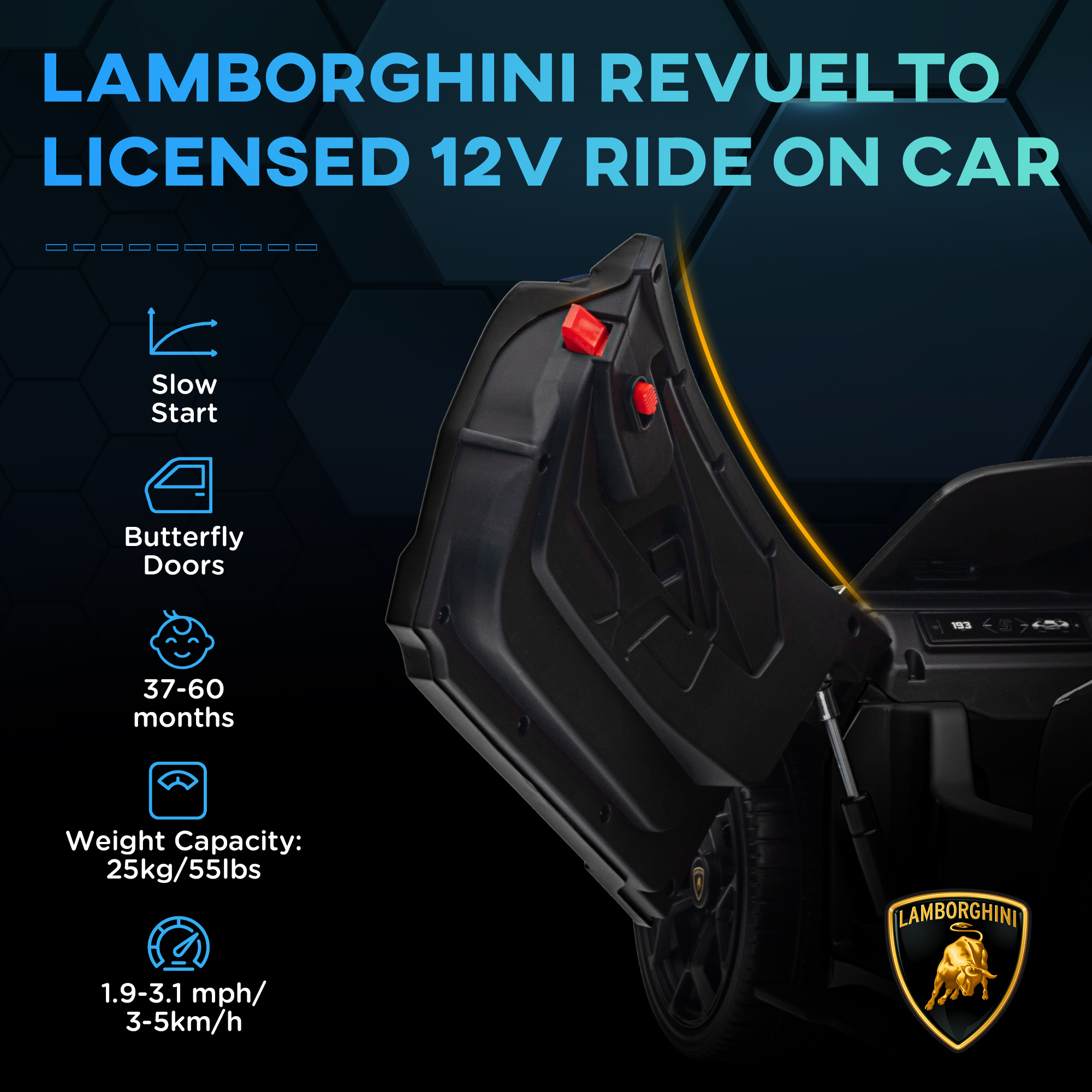 Experience up to 45 minutes of thrilling fun with the AIYAPLAY kids electric car! Officially licensed by Lamborghini, this sleek all-black model stands out with butterfly-opening doors for a touch of style. Offering a genuine driving adventure, it includes LED lights, a horn and music for added excitement. The suspension system offers smooth rides, while the slow-start feature avoids sudden jolts for safety. Includes a remote control for adults, the whole family can join in on the fun.