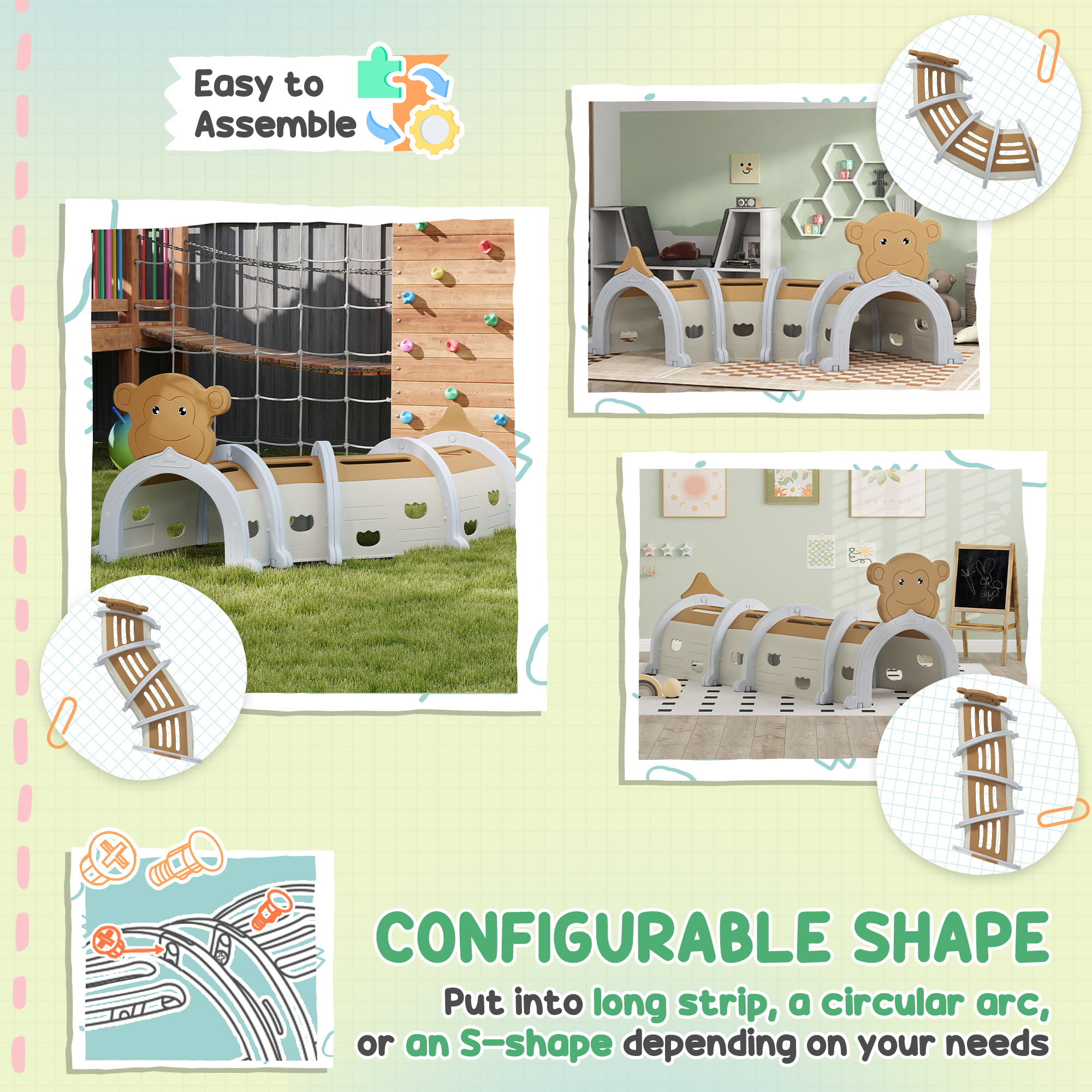 Crawl, climb and play – this kids play tunnel is every toddler's dream! Featuring a charming monkey design, this versatile tunnel can be arranged as a long strip, a circular arc or an s-shape. Great for keeping energetic little ones active, it's made from safe, strong HDPE and is suitable for both indoor and outdoor use. An easy way to elevate playtime, it creates fun adventures in any corner of your home or garden.