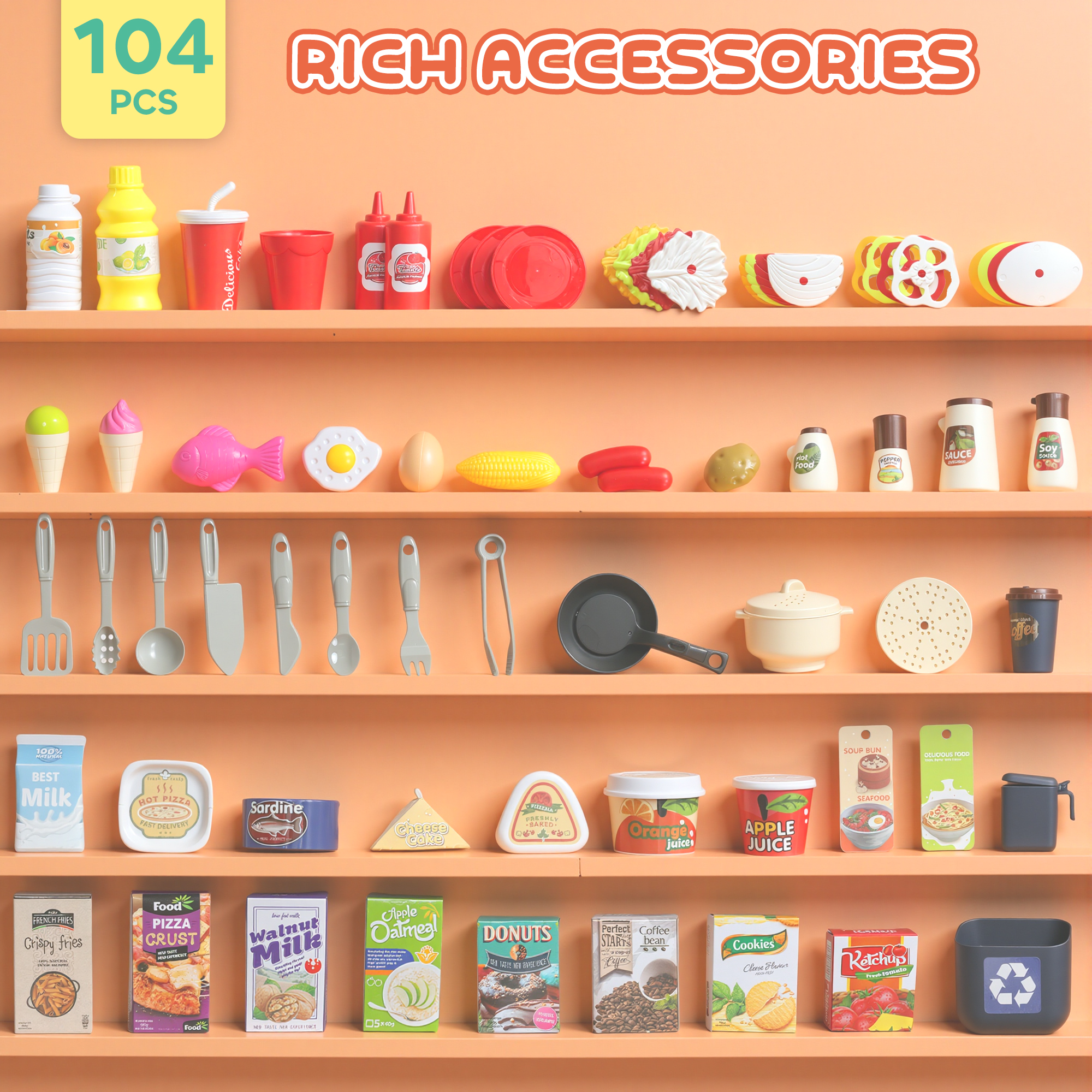 Make playtime exciting with the AIYAPLAY pretend play kitchen set! Designed for little chefs who love to mimic cooking, it includes 104 accessories and realistic features like lights, sounds, spray and a press-down tap, providing plenty of accessories for fun, promoting creativity, hand-eye coordination and teamwork. The open design of the play kitchen set lets multiple kids play together, boosting social skills and keeping boredom away!