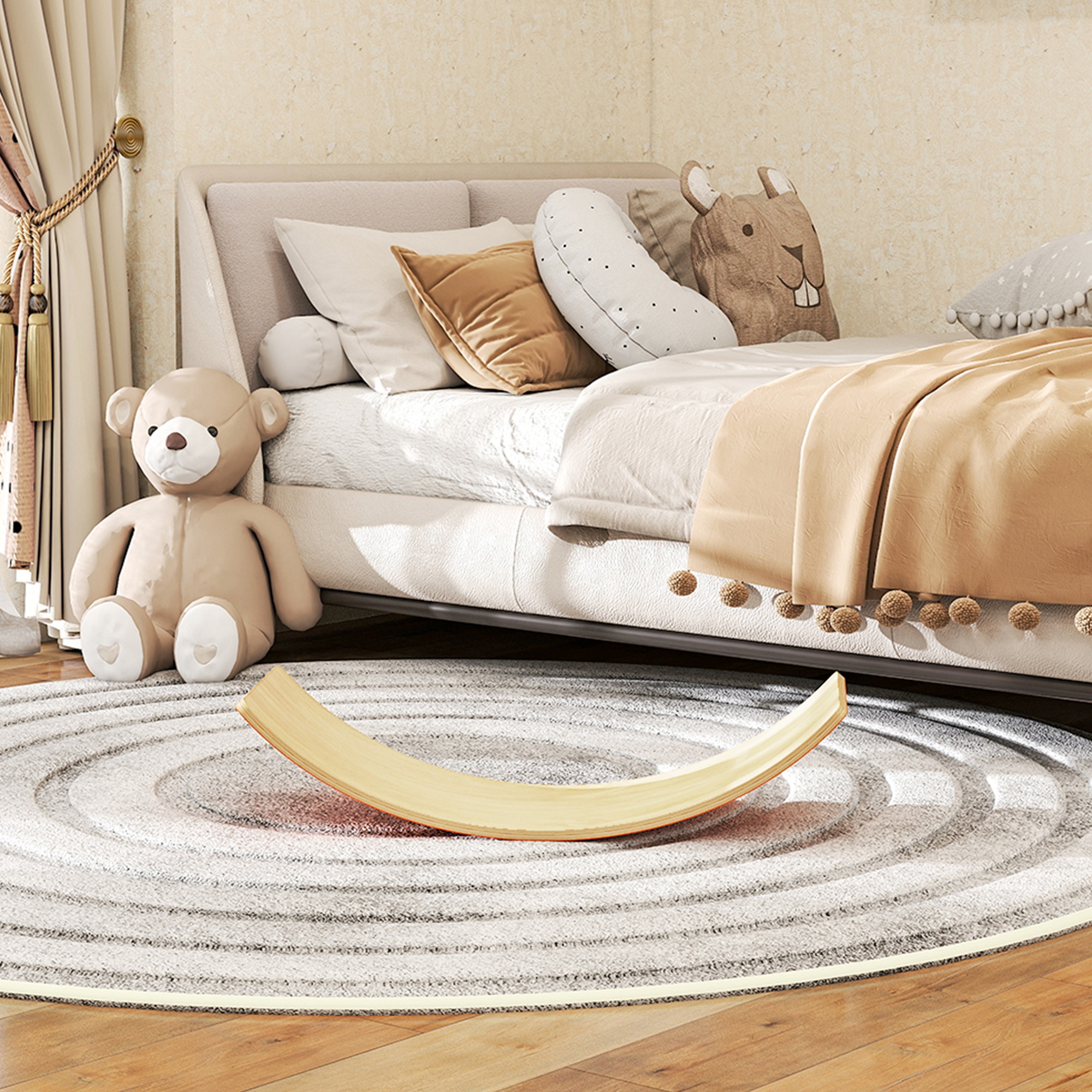 The AIYAPLAY kids balance board is a simple and effective solution to turn boredom into fun and joy. Suitable for ages 3-8 years, children can creatively use it as a bridge, slide, seesaw or rocking chair. The orange felt base reduces noise and provides a non-slip surface for added safety. Made from solid natural wood, it's not just a toy but also helps in developing balance and coordination, encouraging active play and joyful moments at home.