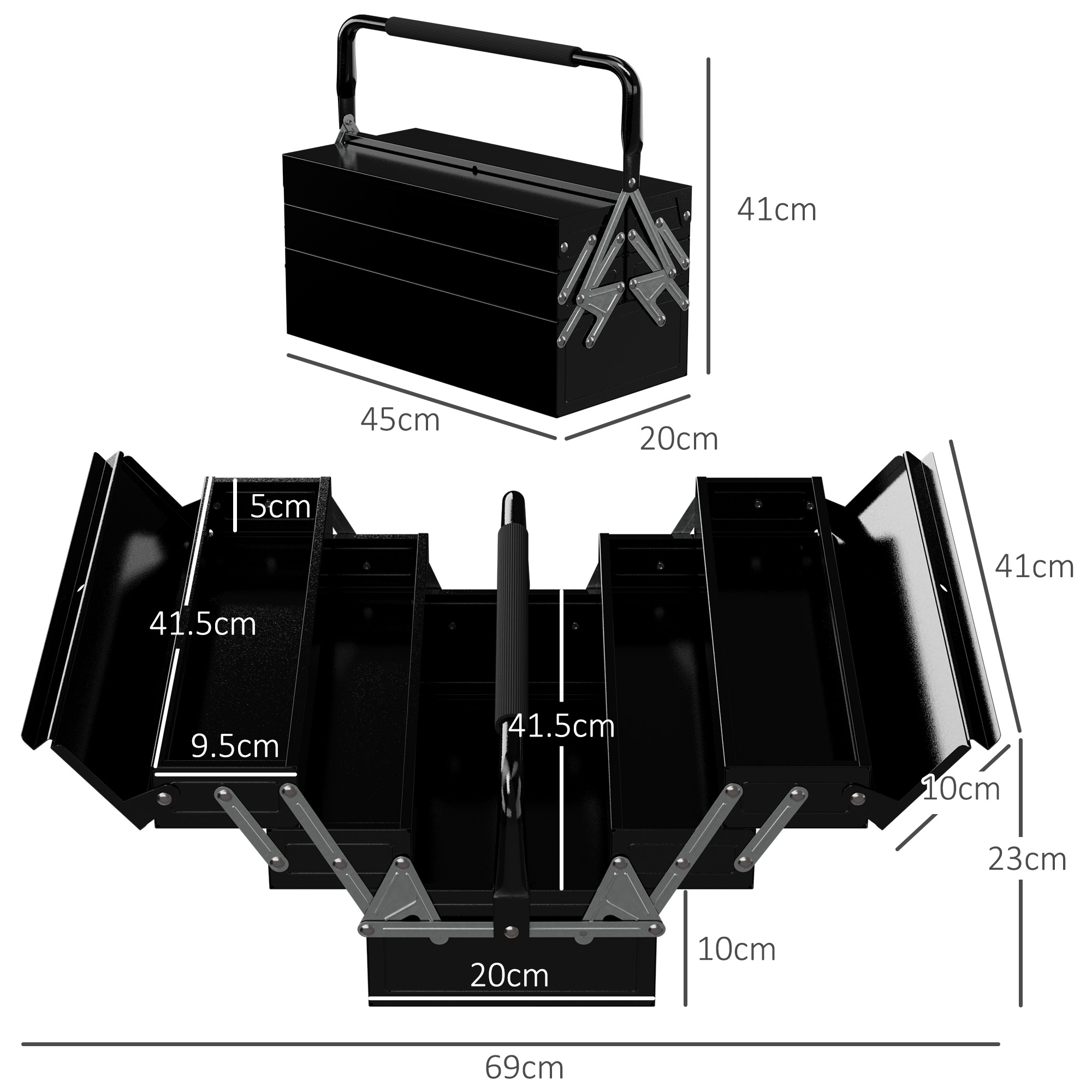 - Features five inner collapsible trays, providing lots of storage space for tools and equipment