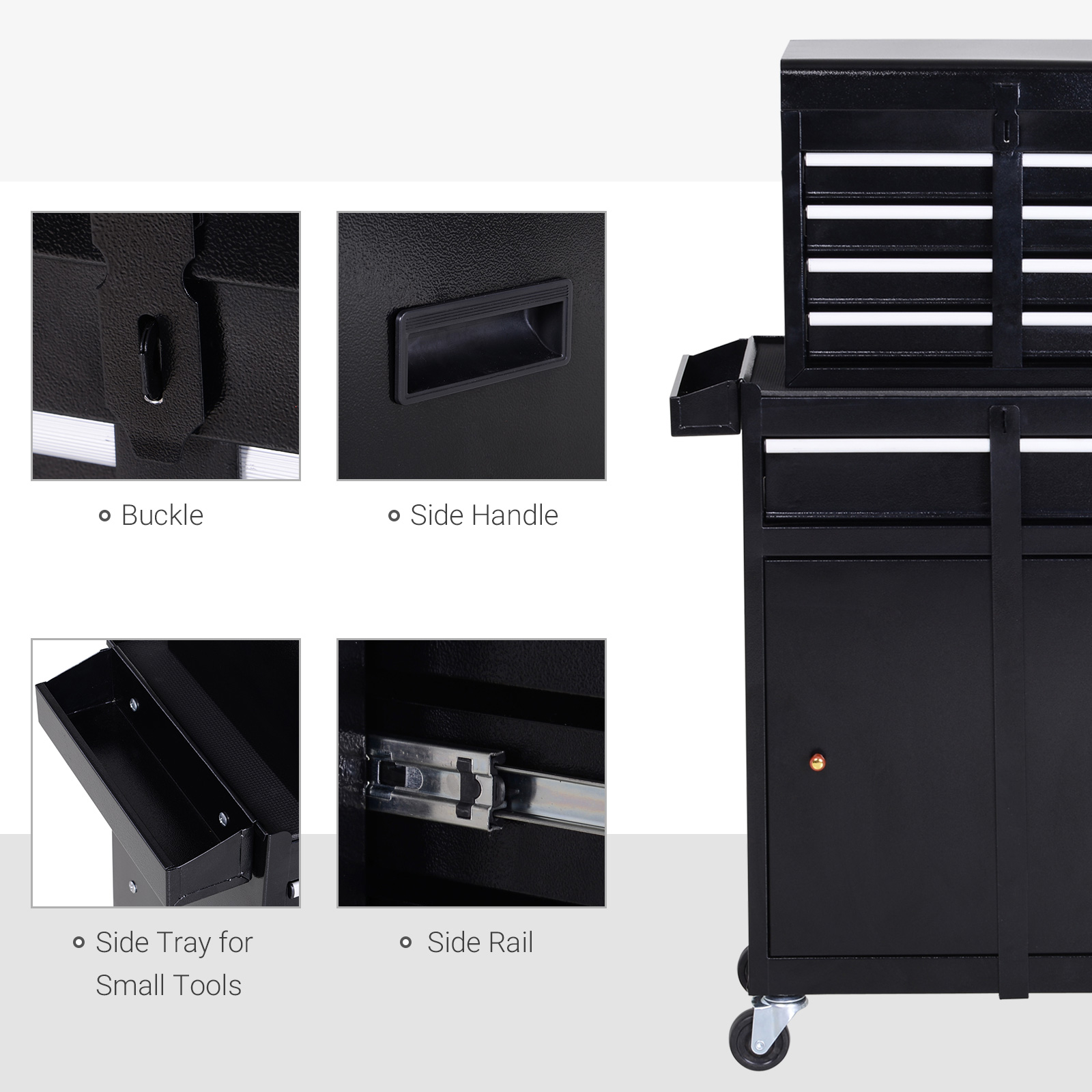 - Both the upper chest and bottom cabinet are equipped with a drawer lock rod to keep your tools safe, (locks and keys are EXCLUDED)