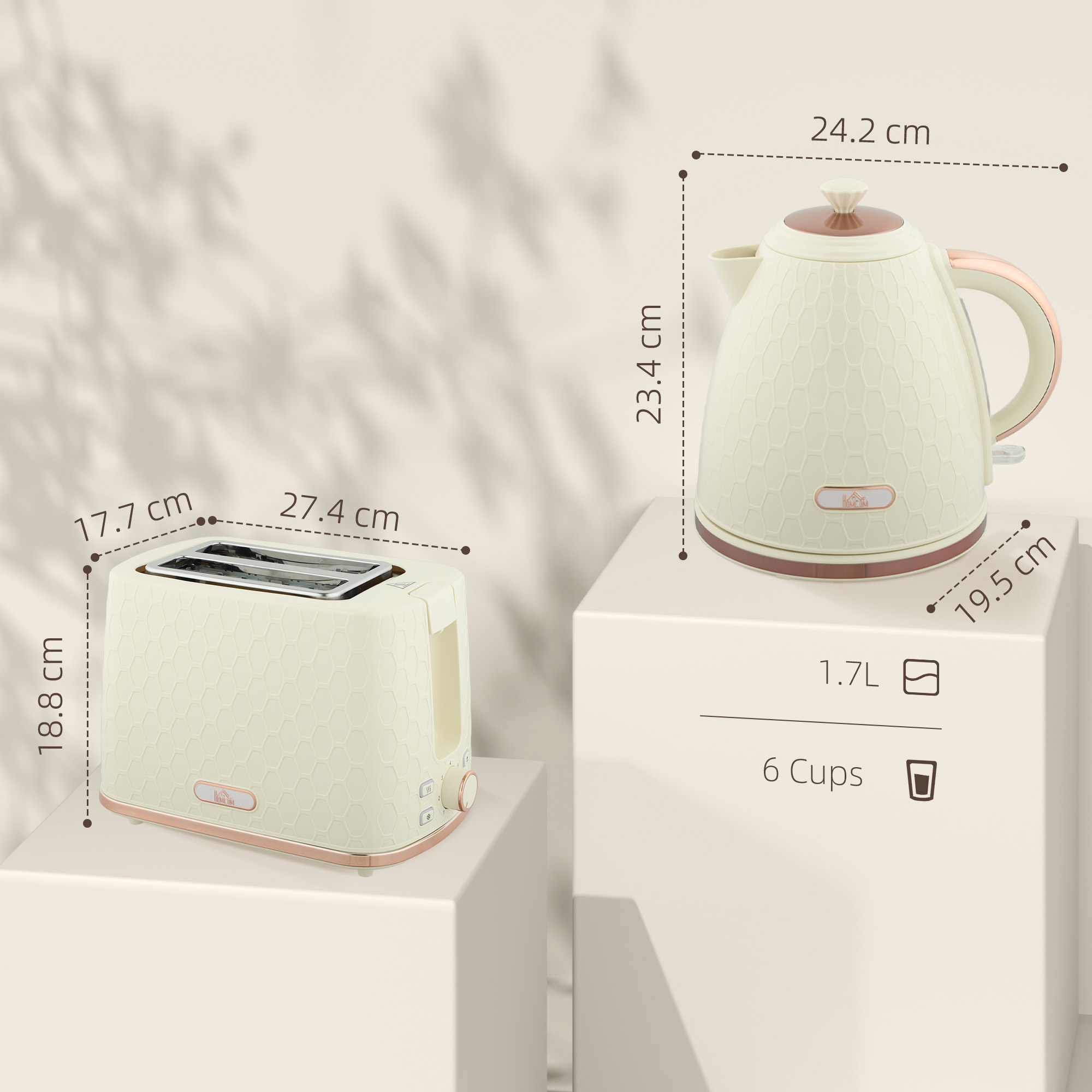 - 1.7L fast boil kettle and matching two-slice toaster. Stylish honeycomb design