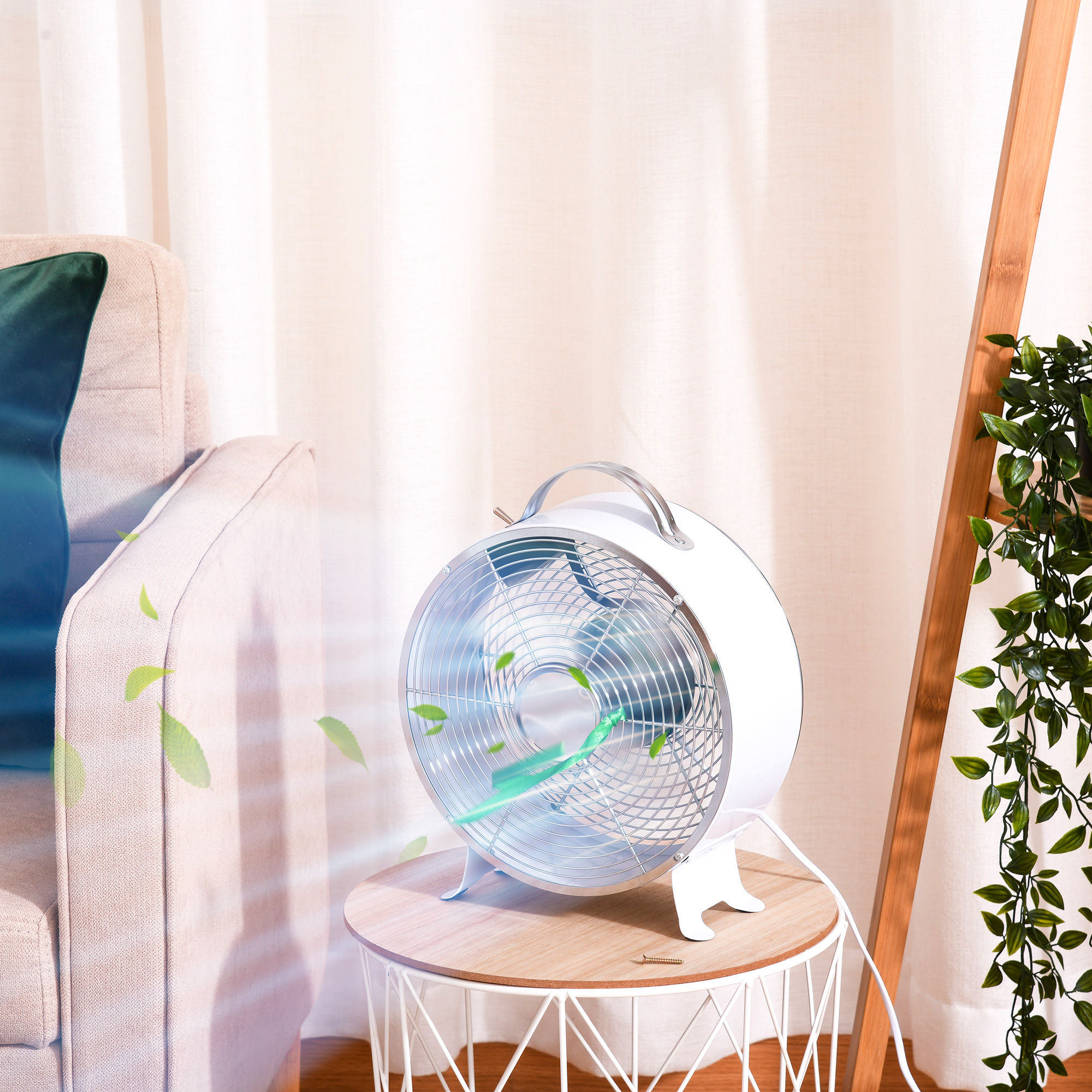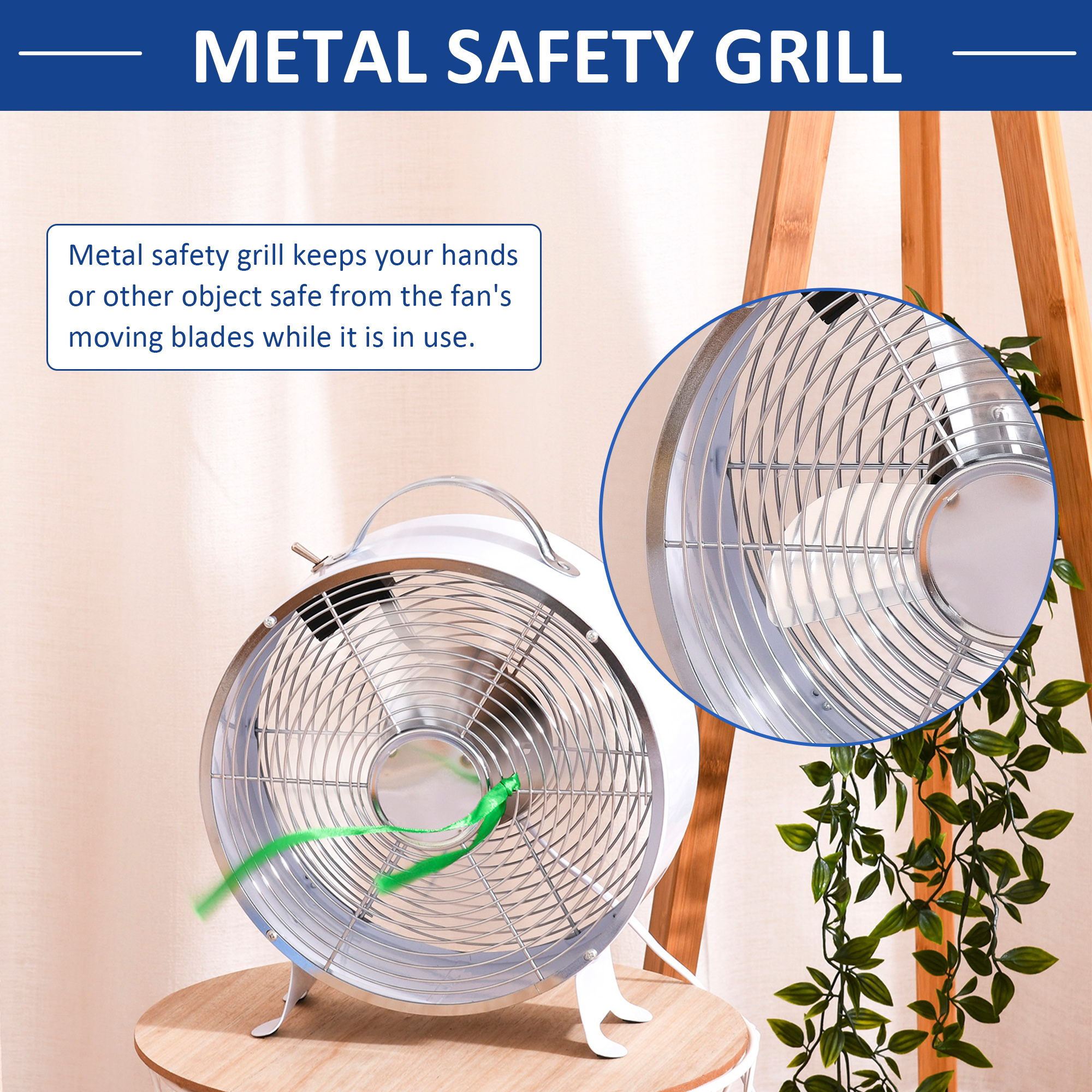 Keep cool almost anywhere with this table fan from HOMCOM. It has two speed settings - low and high - so you can choose the power which is best for you. There are four metal blades inside which continually push out air, with a metal grill on the outside to prevent direct contact with the blades for safety. Metal feet and rubber mats keep the desktop fan stable when on. Ideal to keep cool almost anywhere during hotter days and nights with our HOMCOM small fan.