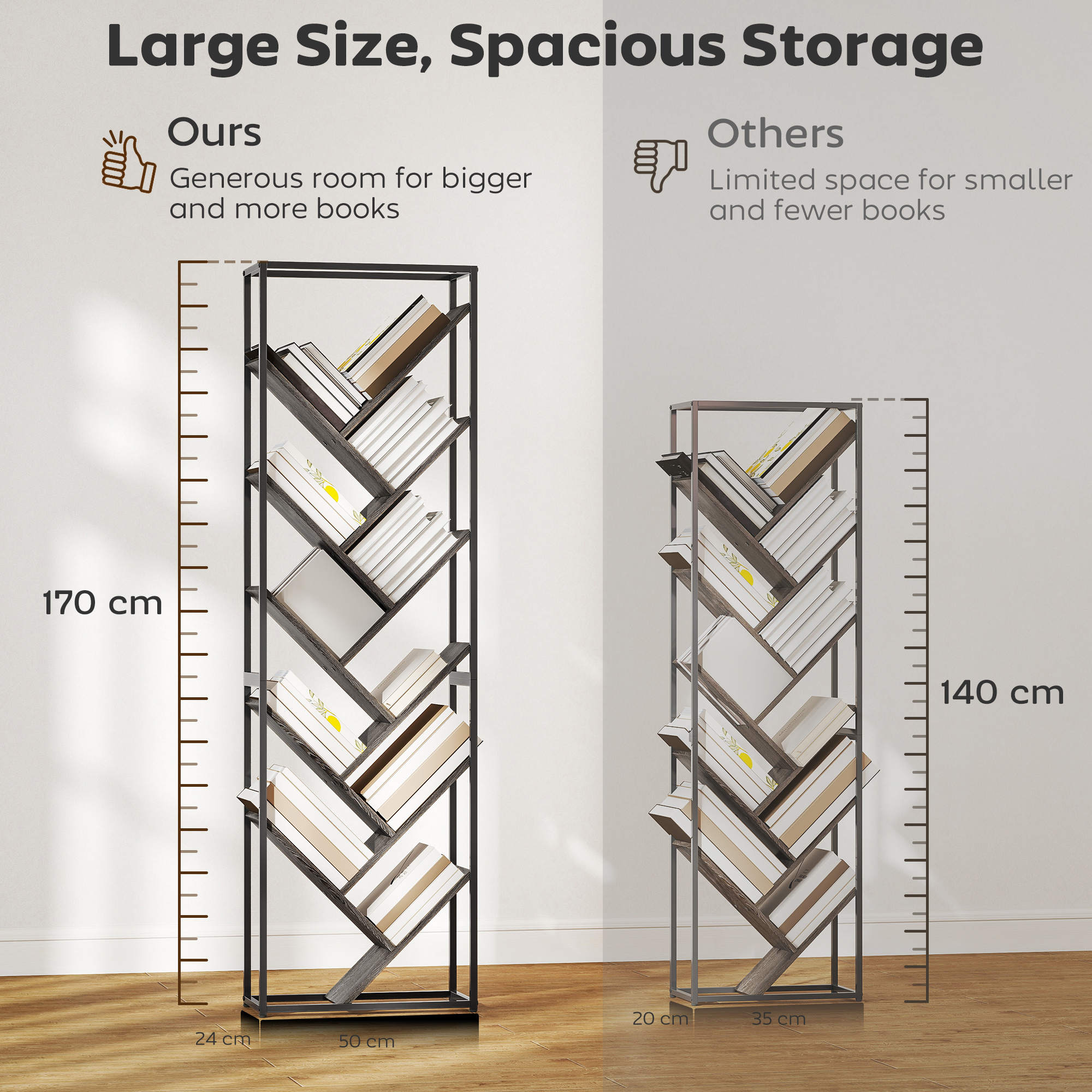 The cool, compact way to hold your book collection - this HOMCOM tree bookshelf. At 170 cm tall, it takes up just 0.12 ㎡ floor space, making it great for smaller spaces. It showcases ten slanted shelves - shaped like branches - to hold plenty of books. With a metal frame for a strong core, it comes with anti-tipping straps to secure in place to a wall.