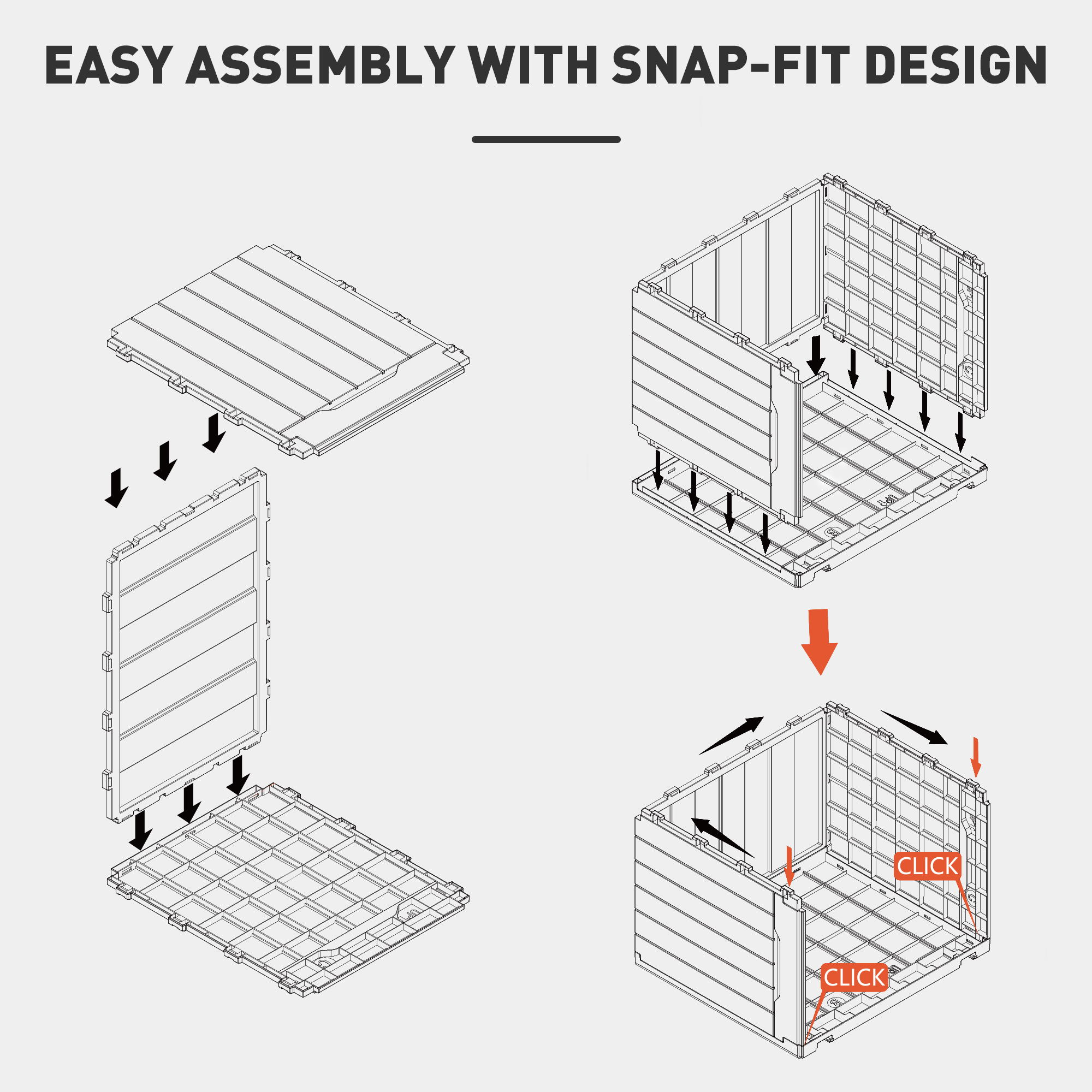- Snap-fit design allows quick, hassle-free assembly