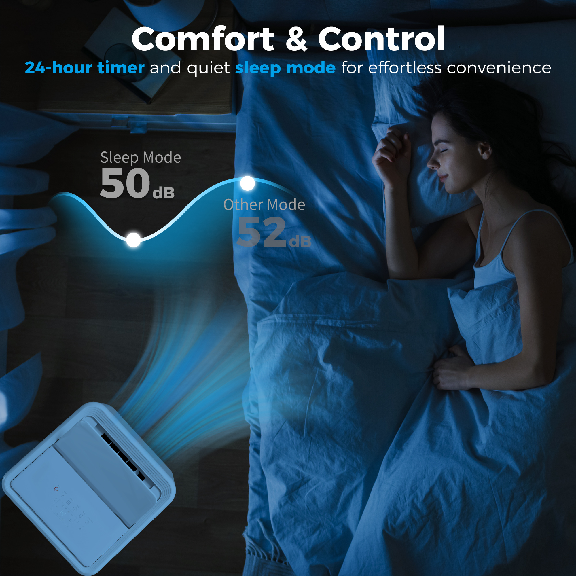 - Five modes: Cools, dehumidifies, ventilates, auto(energy-saving) and sleep (quiet operation)
