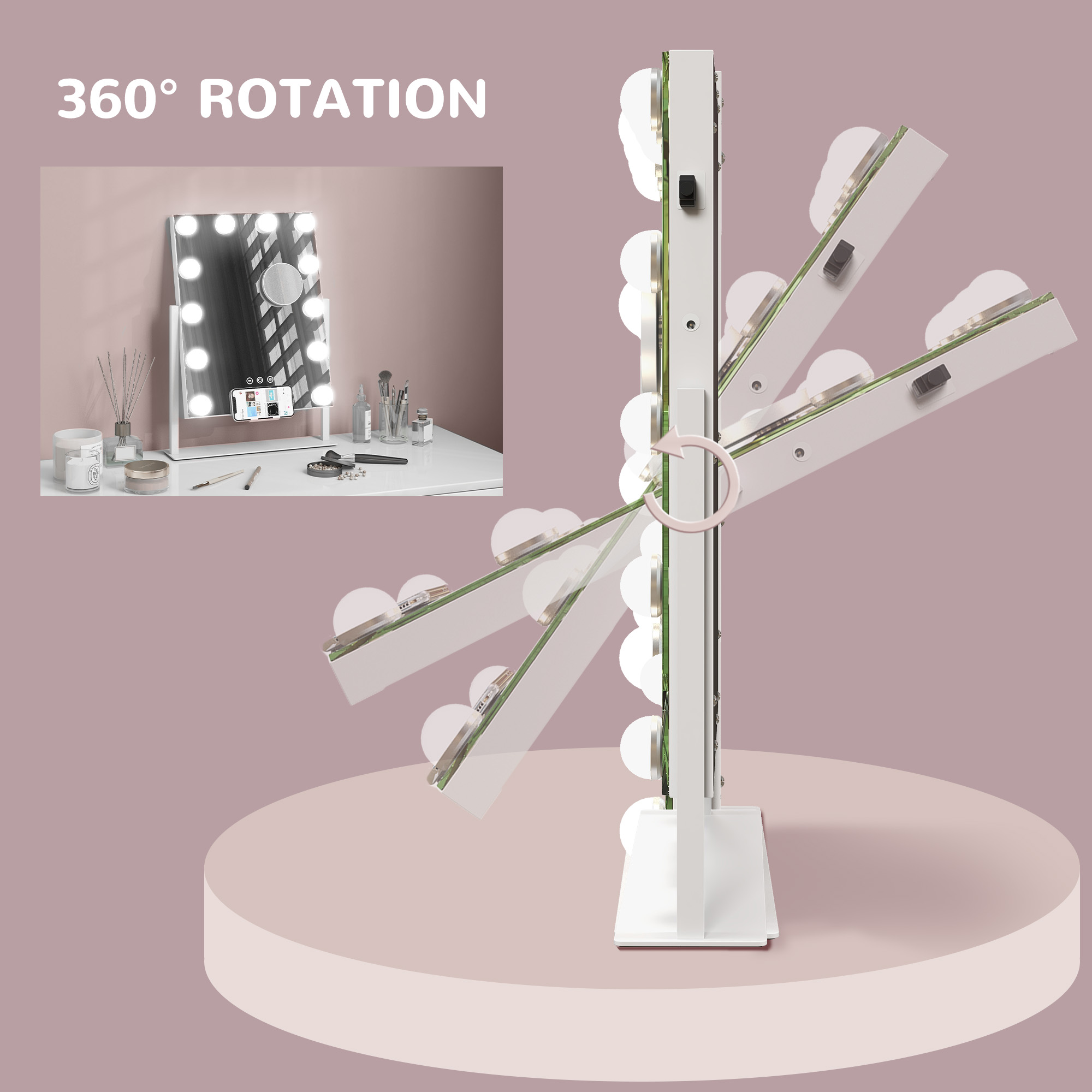 - 360° rotation on a metal frame: stable placement, move to an angle you want