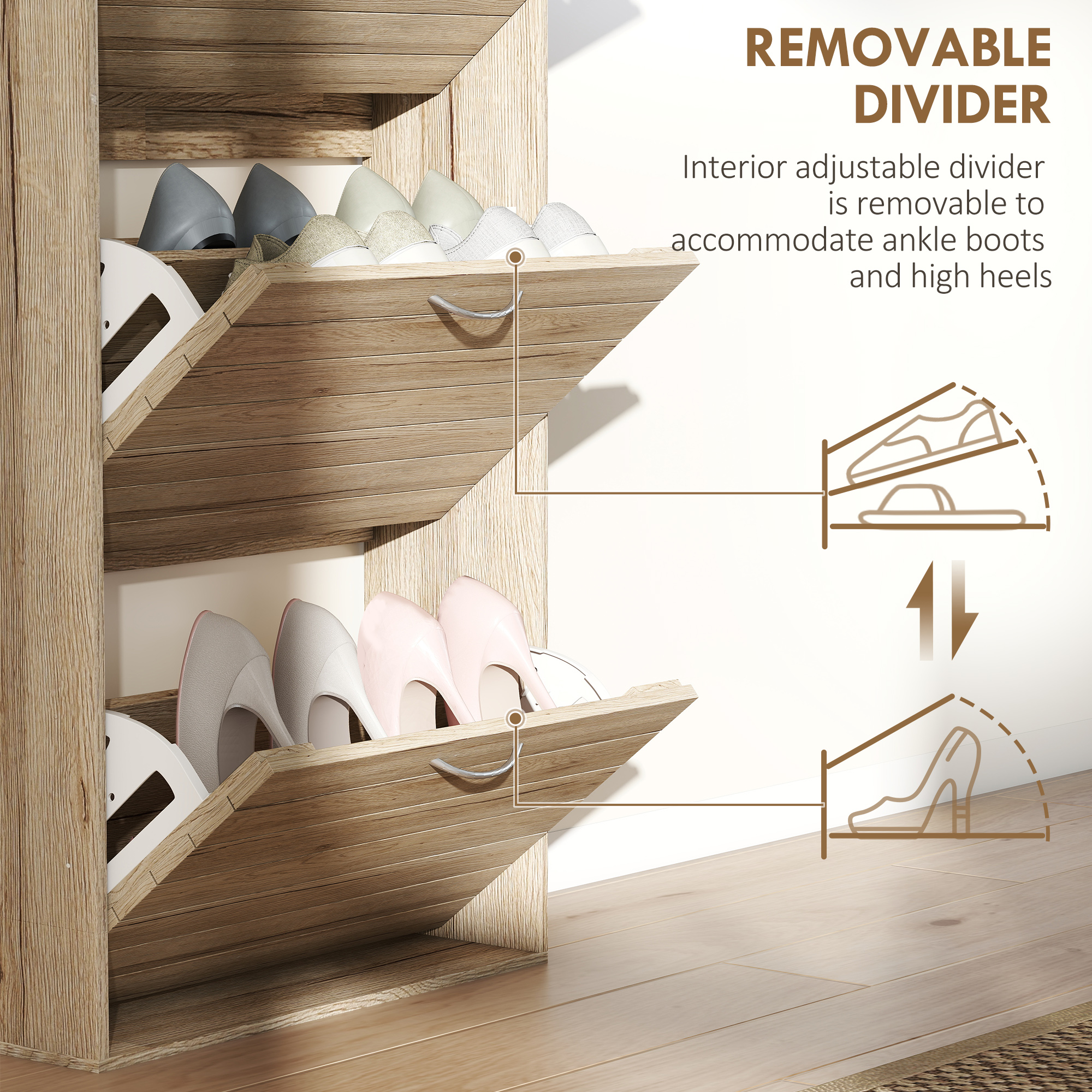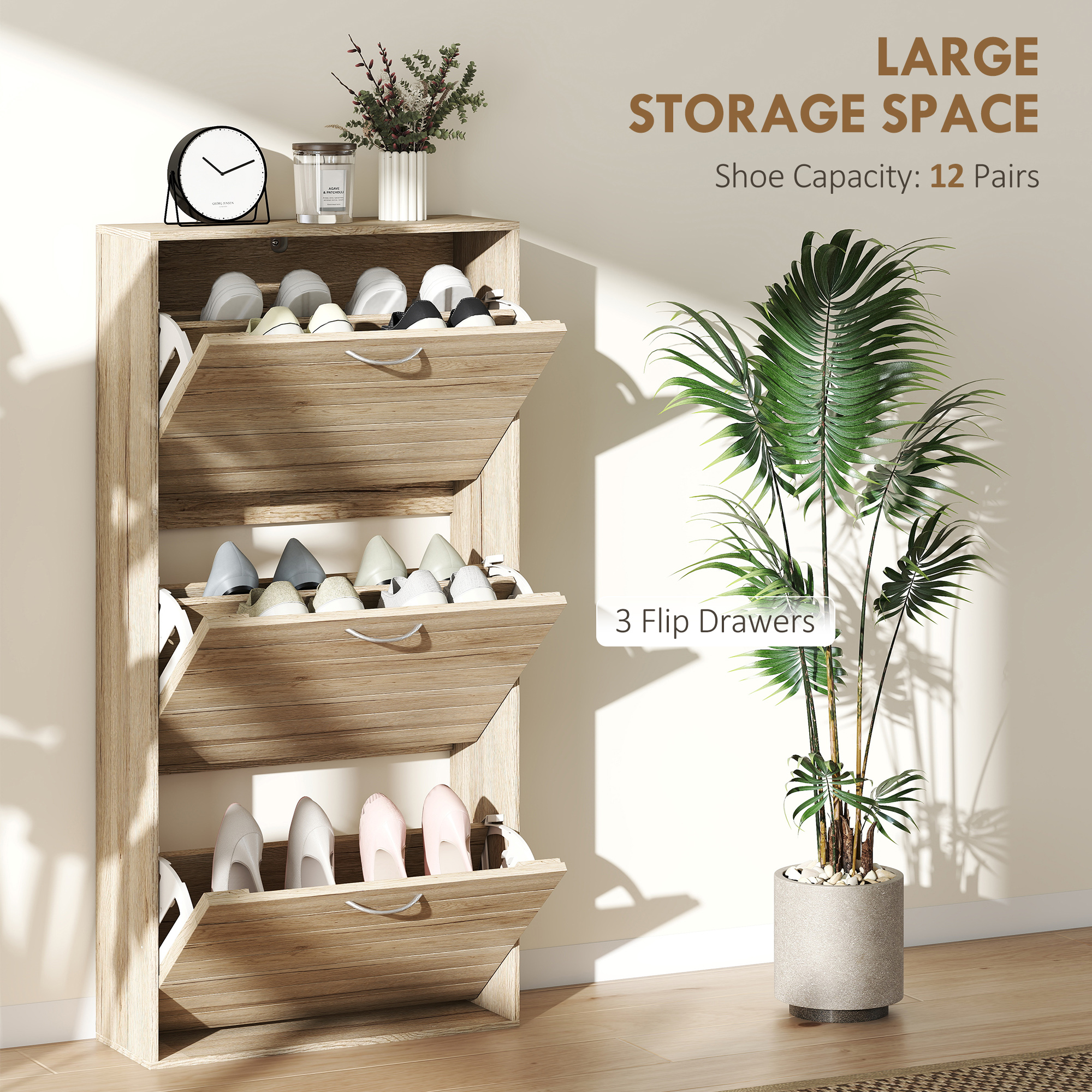 - Three flip drawers: easy to access. Holds up to 12 shoe pairs