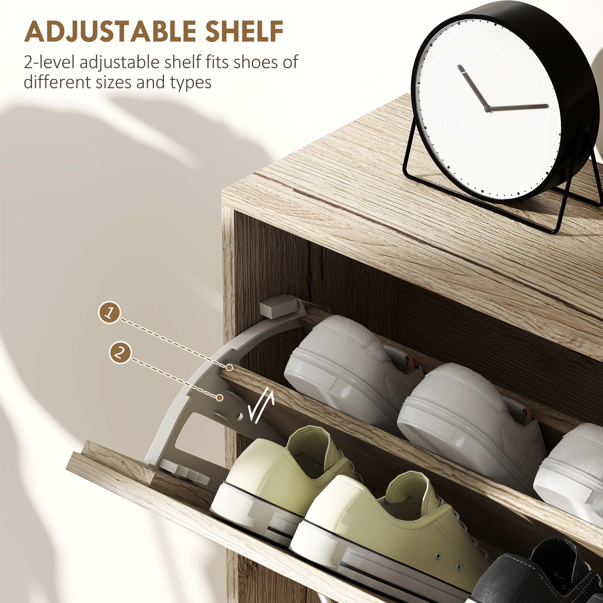 - Two-level adjustable shelf in the each flip drawer: adjust the size easily
