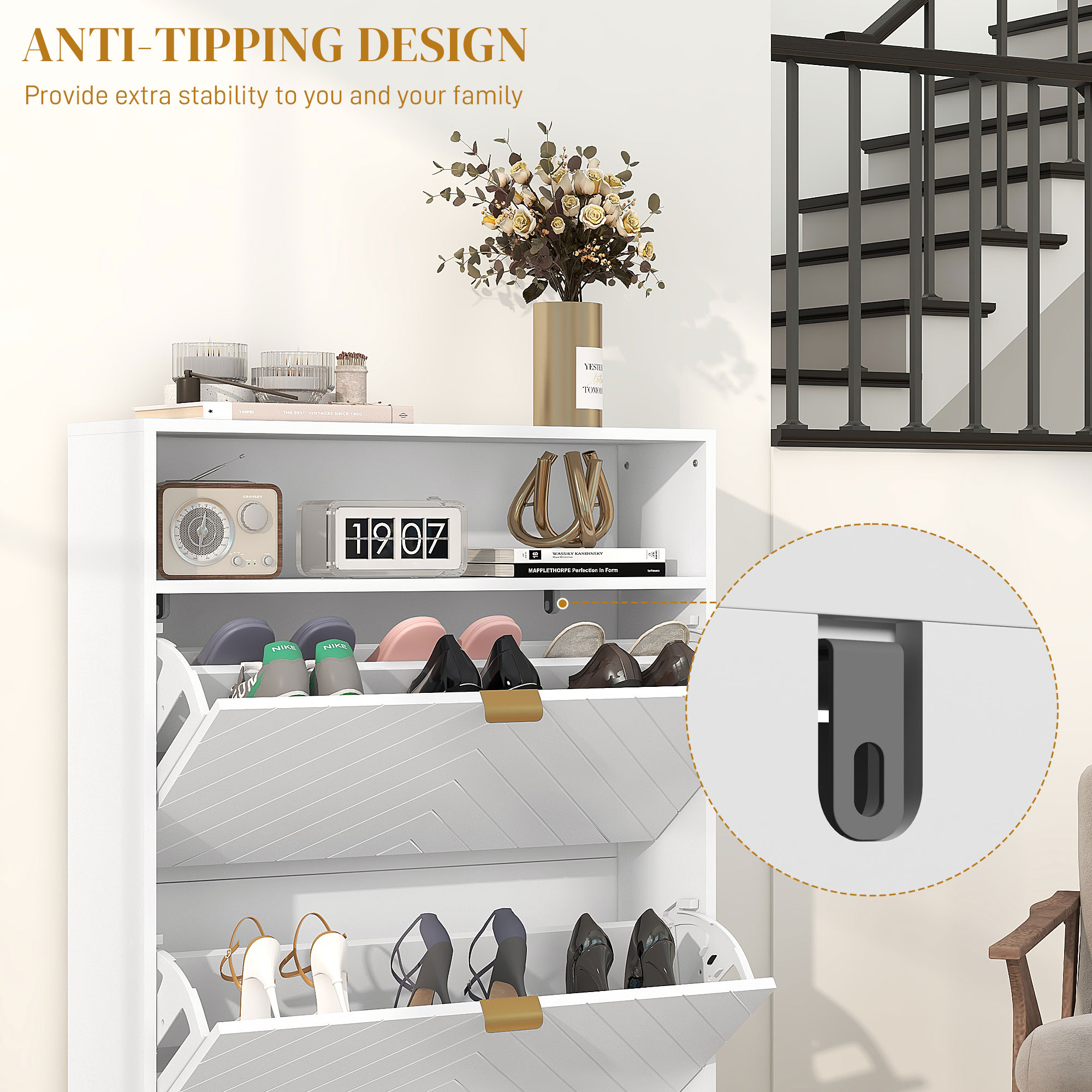 Safeguard footwear from dust and dirt, whilst giving them a permanent home with this HOMCOM shoe cabinet. Two flip drawers hold up to 12 shoe pairs maximum size UK 9; the adjustable inner shelf caters for larger footwear. Display your favourite decorations on the top shelf. Slim shoe cabinet comes with anti-tipping straps to safely attach to a wall.