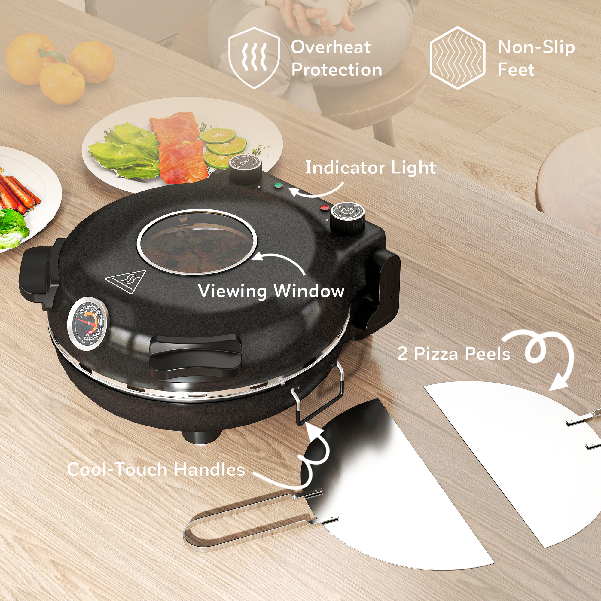 - Dual heating elements reach 800℉ for crispy pizzas in 5 minutes