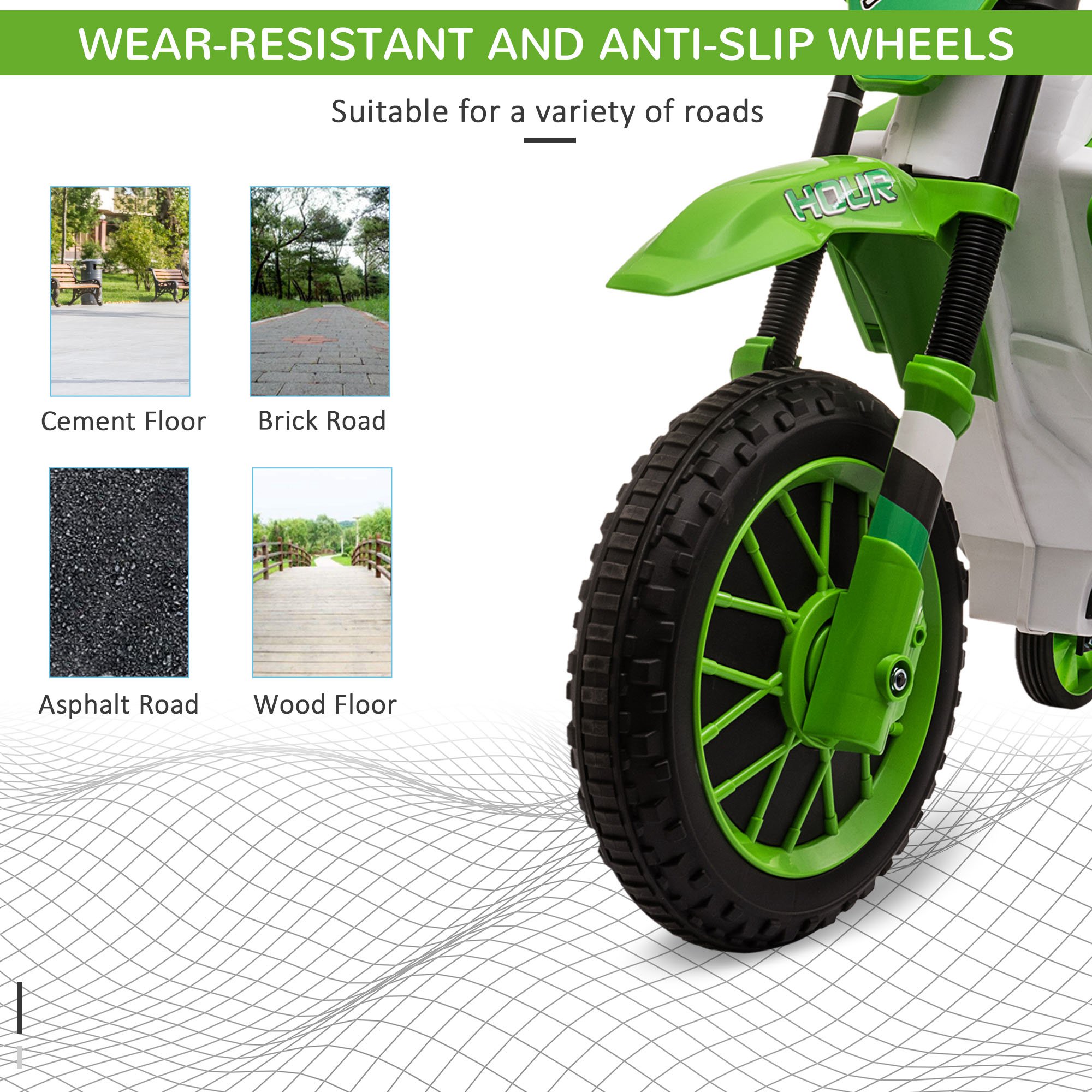 Excitement, fun and adventure – that's what this HOMCOM kids ride on electric motorbike brings to your child. Its white and green appearance is cool and sporty, letting kids feel like prime motorsport drivers. There are two speed options, 3 and 8 km/h, so it won't go too fast, whilst the removable training wheels keep beginners properly balanced - there's also shock absorbers for a safe and smooth ride. Finished with a rechargeable battery, lasting for 45 minutes.