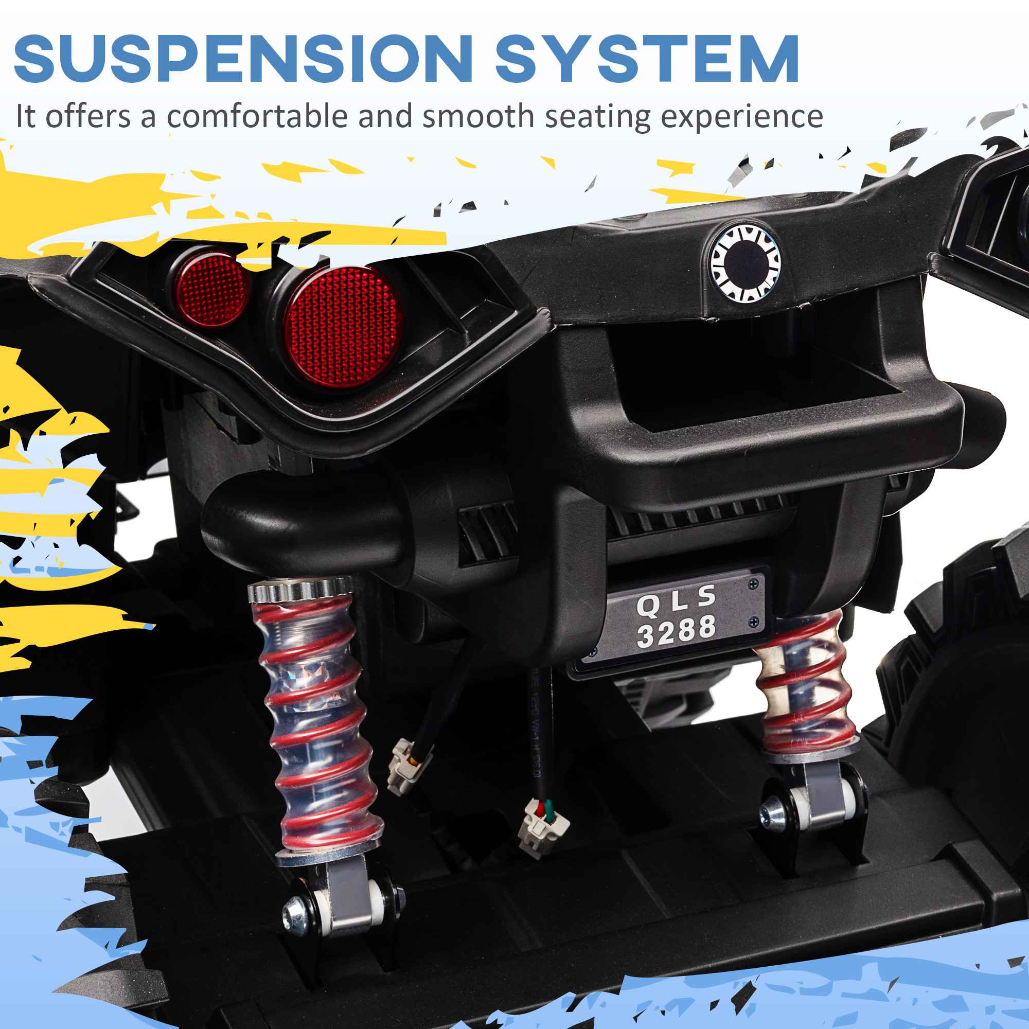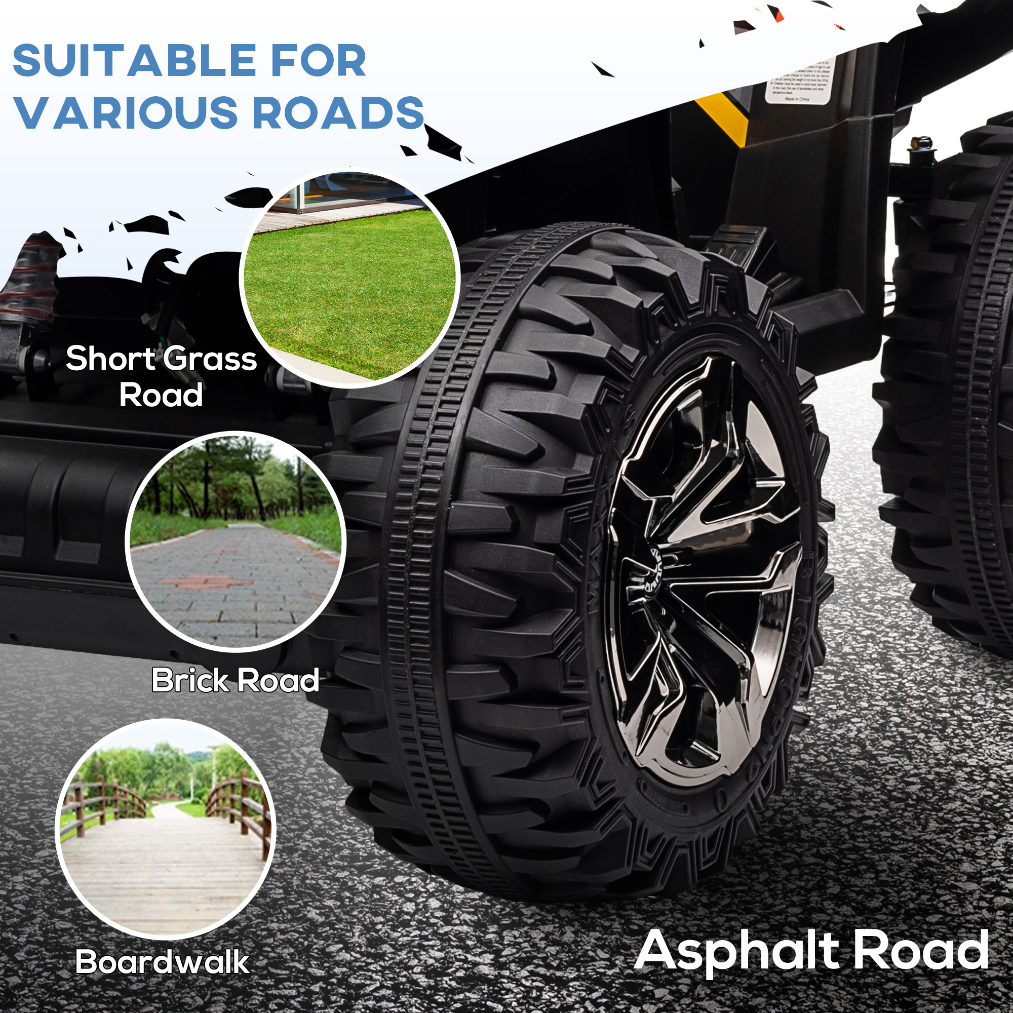 - A 12V motor, this ride-on can ride on different terrains