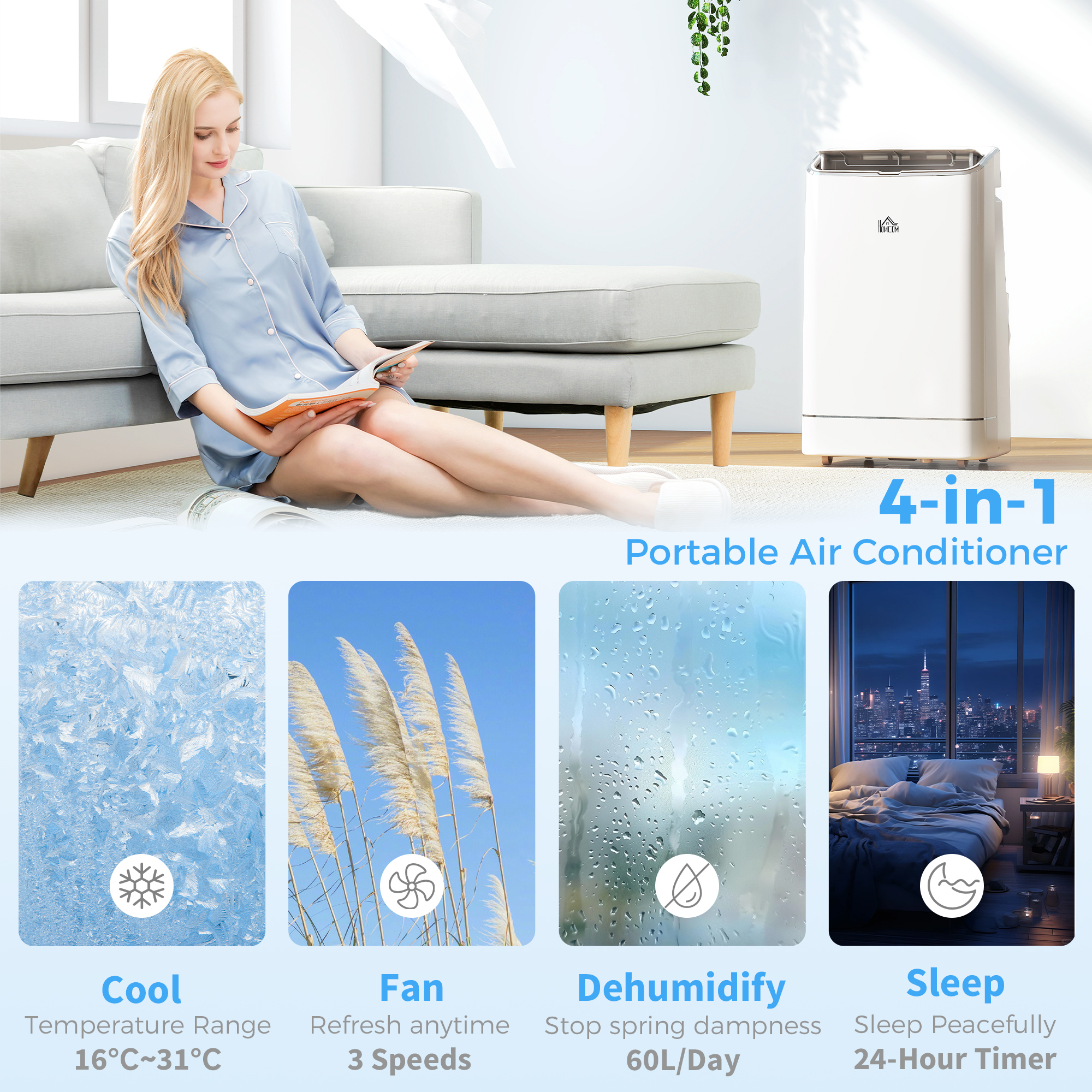 - Two speeds and adjustable 16-31℃ temperature