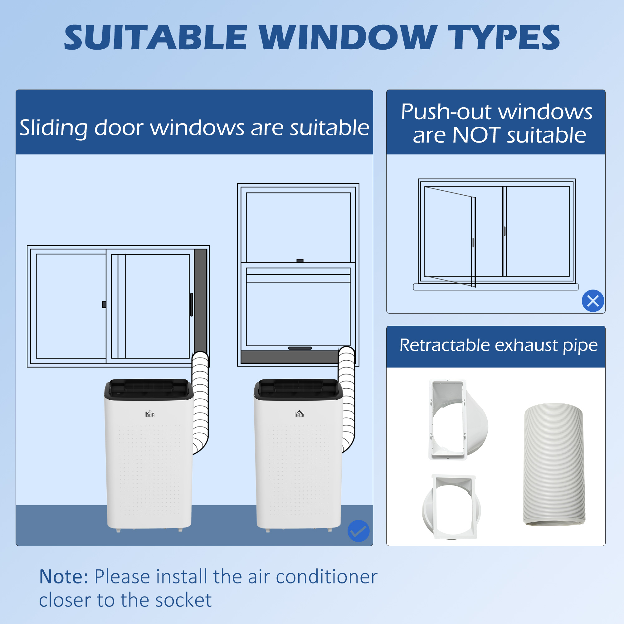 - Sliding window kit included, exhaust pipe is retractable. Assembly required