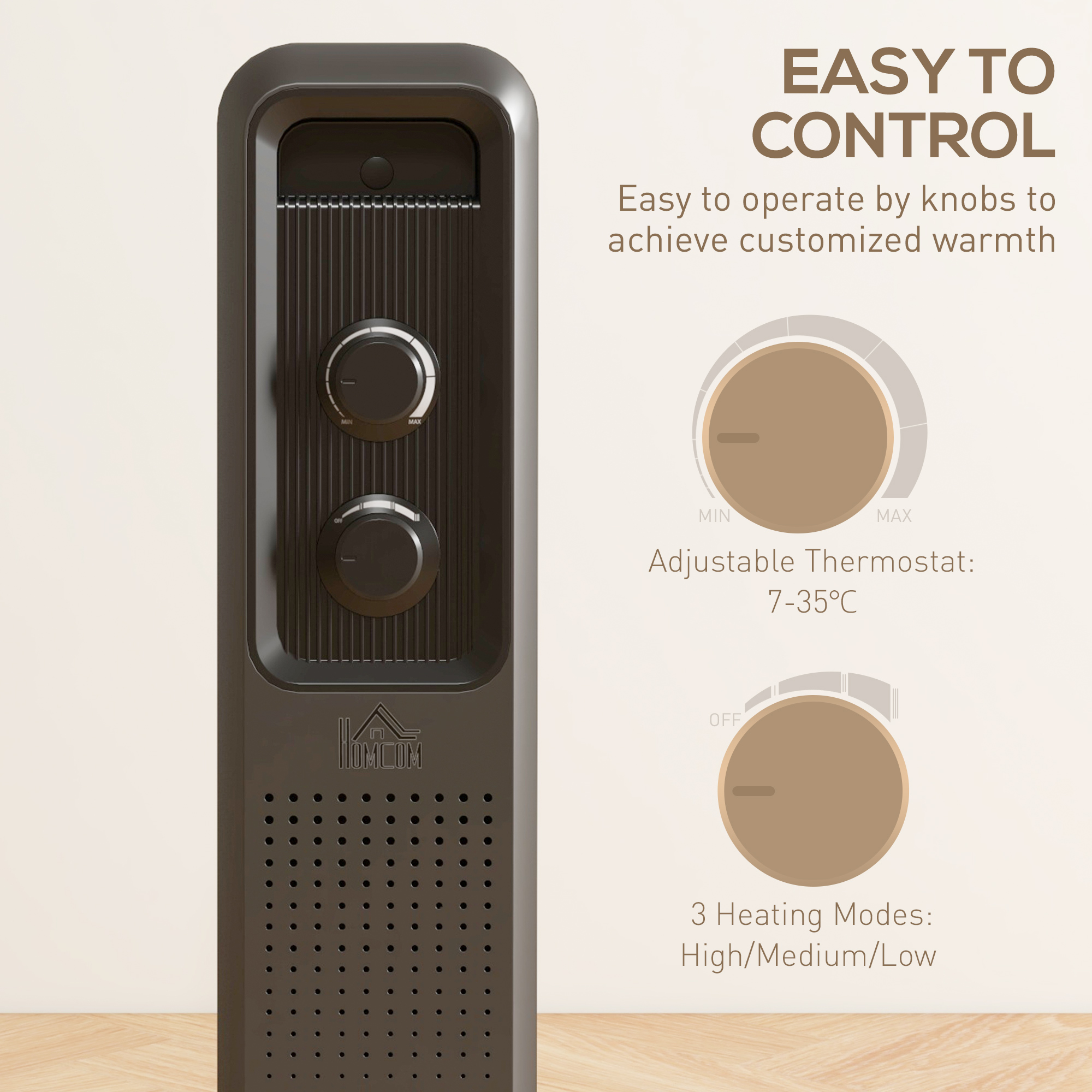 Keep warm with this oil filled radiator from HOMCOM. With an adjustable temperature of 7-35℃ and three heating modes, you're in control of the heat you want. The overheating and tip-over function will turn it off safely, so you can enjoy this portable radiator with peace of mind. Move with minimum fuss using the wheels and handle, making sure no room goes cold. It's complete with a cable organizer for tidiness. Get a cosy winter by HOMCOM electric radiator.