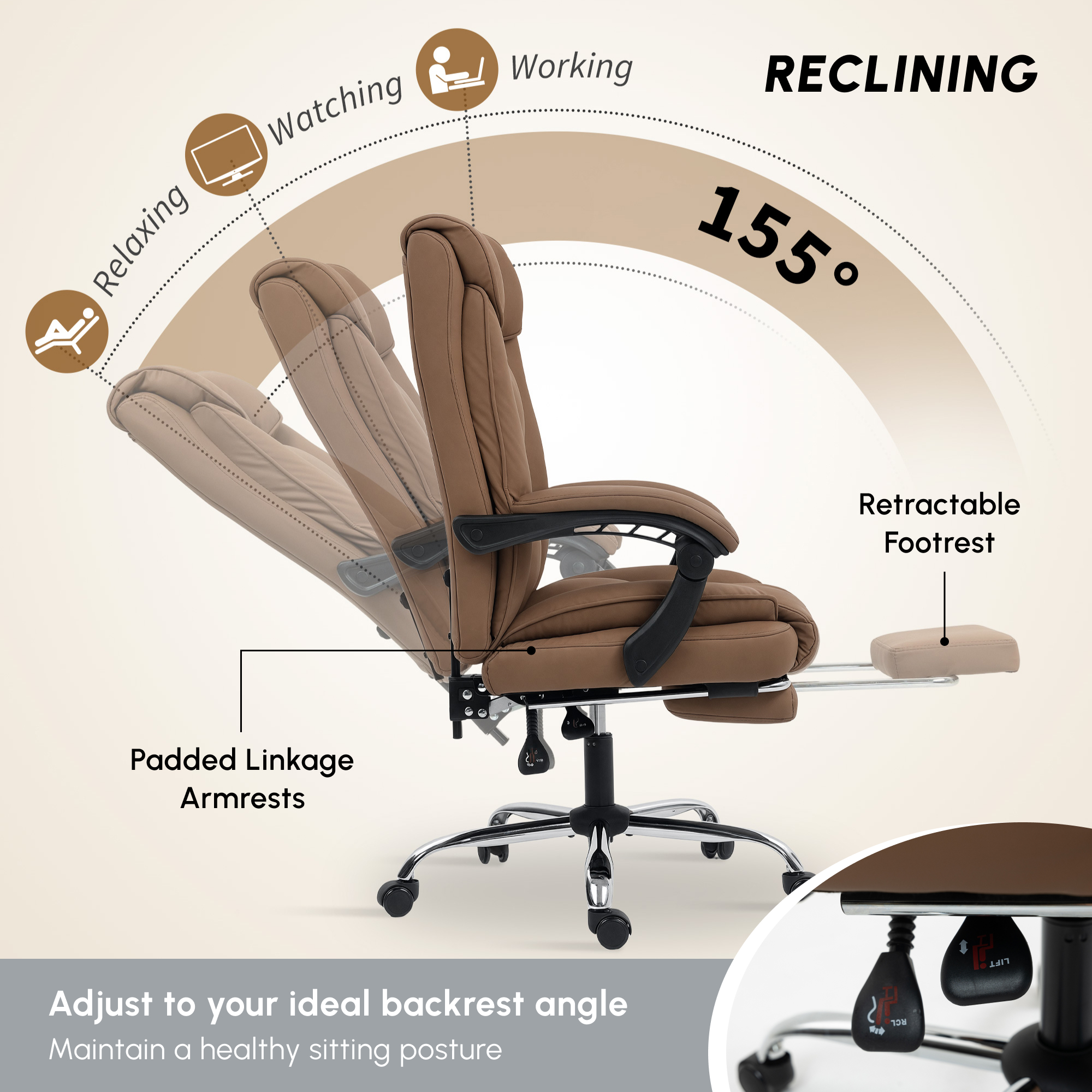 - 155° reclining back, with footrest. Easy to relax the whole body during the work day