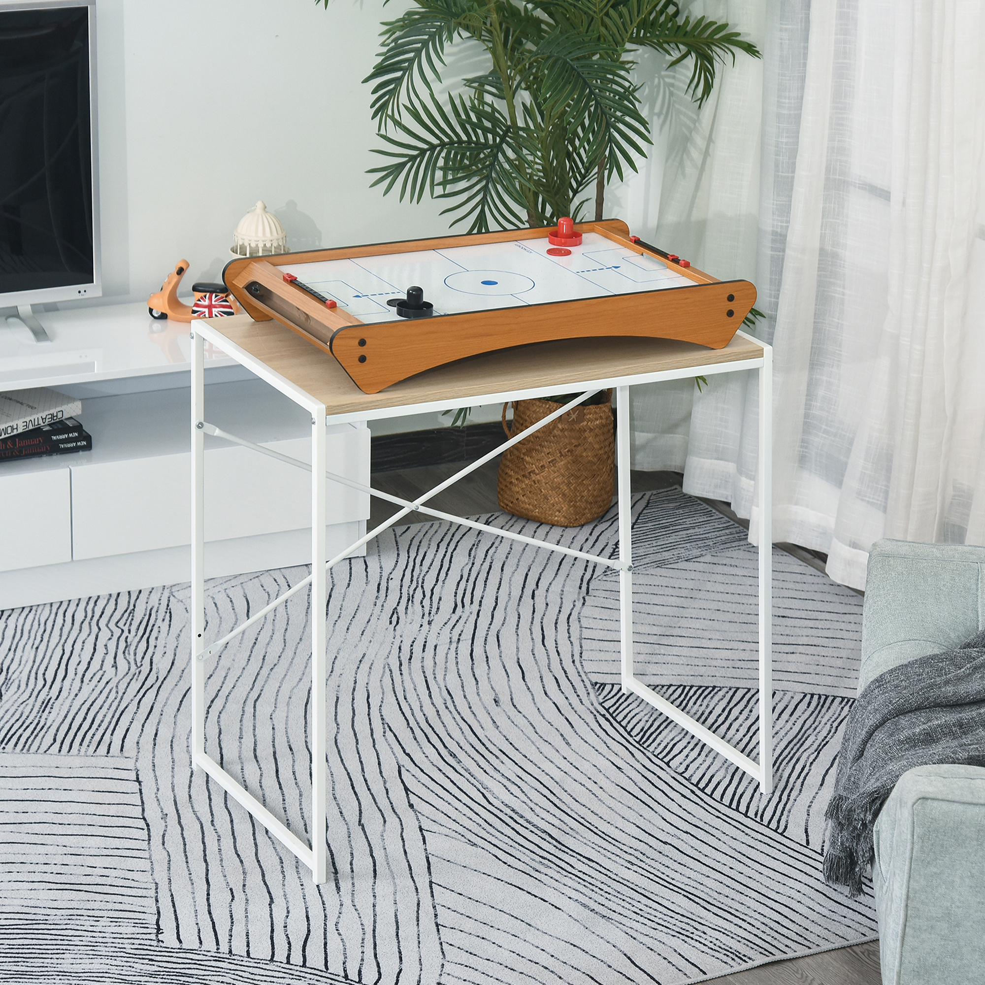 Create fun for all the family at any time with this HOMCOM air hockey table. Using MDF for the frame, it is crafted into mini 72.5 x 40W design to fit almost anywhere, featuring a top game board with realistic line markings for play. It is fitted with a fan motor which allows the puck to move on the board freely for exiting play. A game counter on each side keeps track of winning, with it totaling up to nine point. Two pushers and two pucks are included, requires 6 x AA batteries (not included).