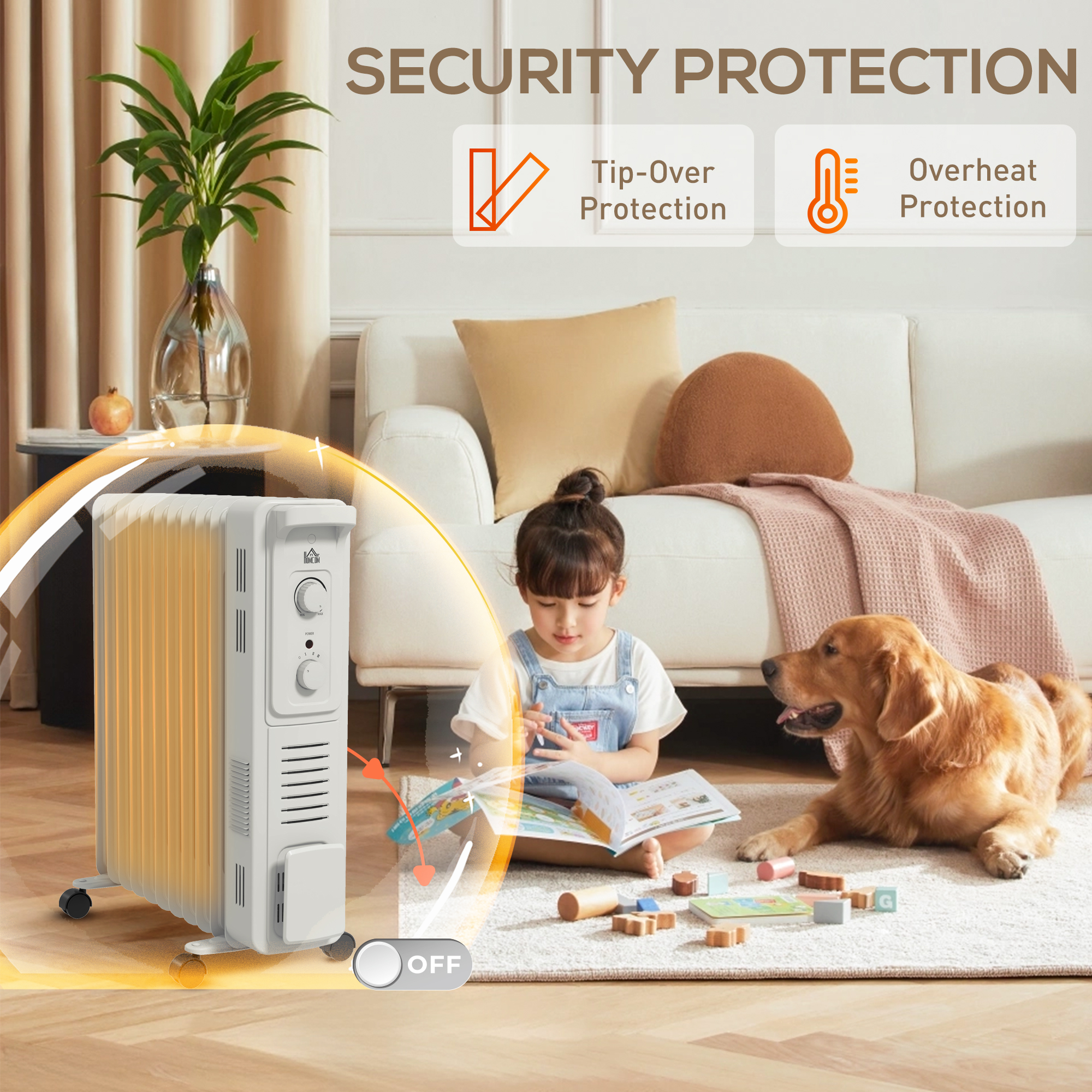 - Auto-shut off: radiator turns off if it overheats or tips over