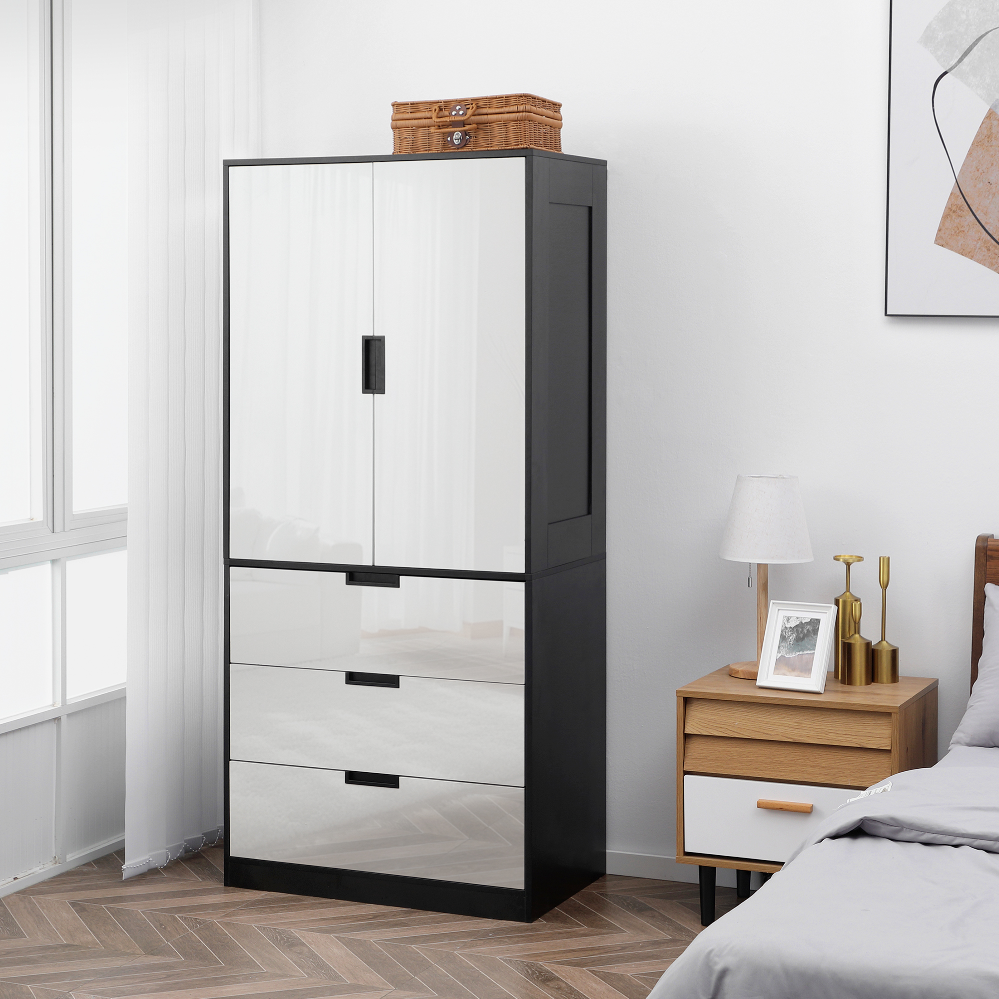 Not just a wardrobe with drawers, this HOMCOM black and high gloss white wardrobe with drawers adds a dash of character with its black accents. The double size offers plenty of room for hanging clothes, with three drawers for folded garments. Made from particle board, it is strong and solid - great for everyday use.