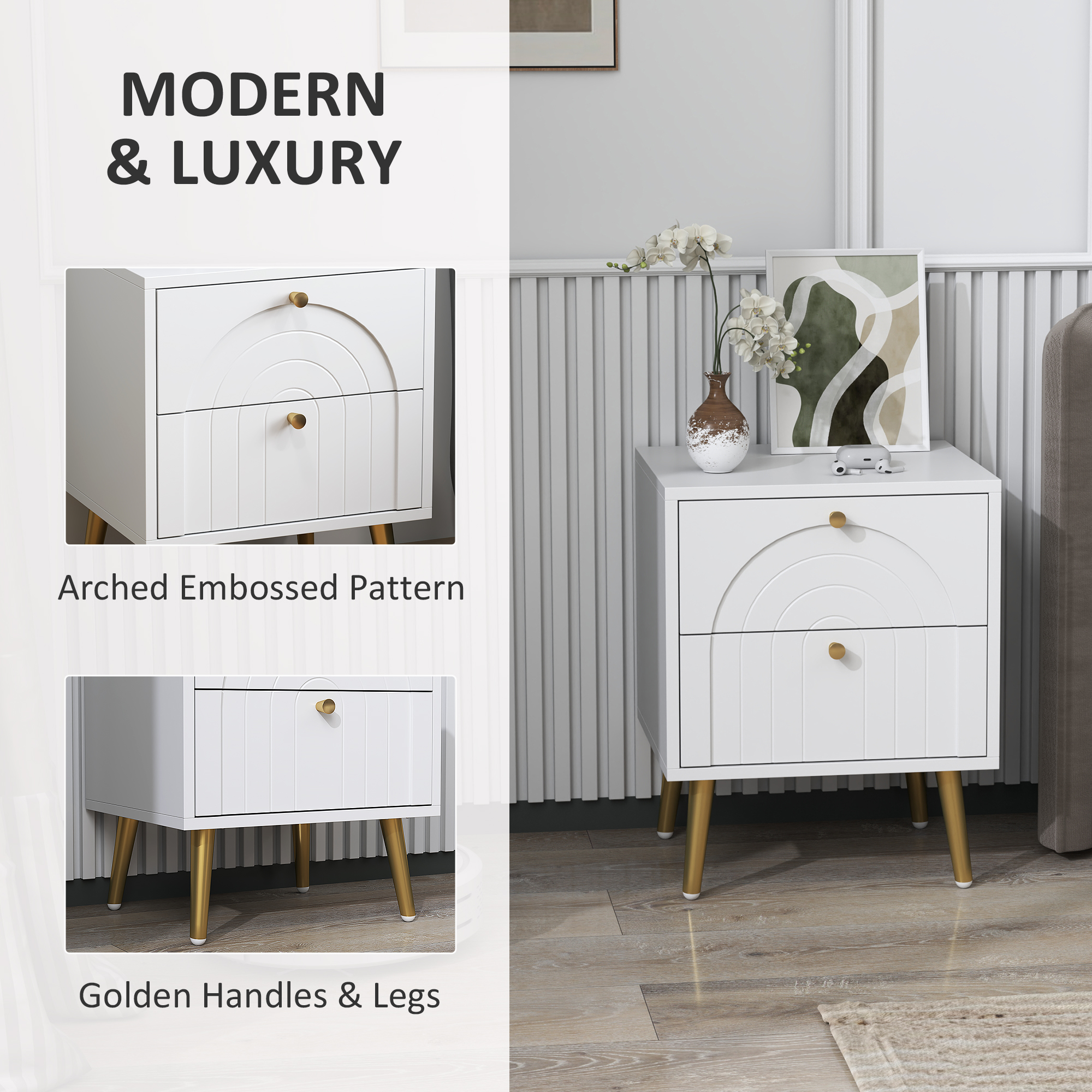 Transform your bedroom with the HOMCOM nightstand, a charming duo that doubles as stylish side tables. Each white bedside table features two spacious drawers adorned with an arched embossed pattern, complemented by gold-tone pulls and legs. The flat tabletops offer additional space for your night-time essentials, making these small bedside tables as functional as they are elegant.