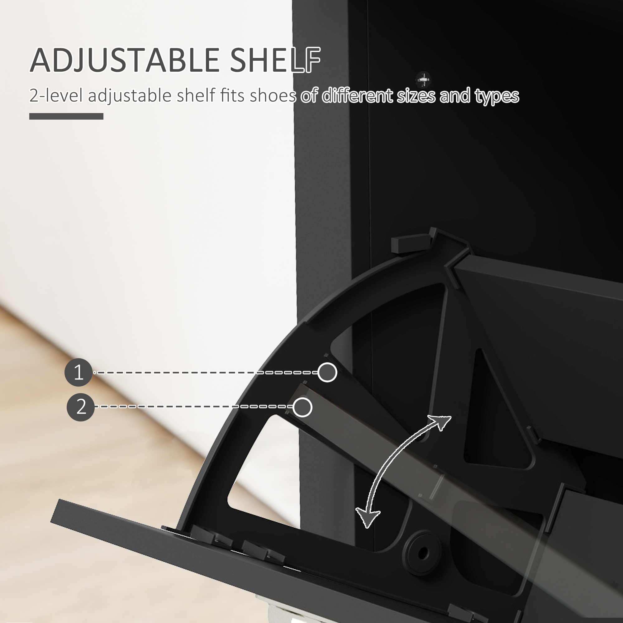 Too many shoes and nowhere to keep at home? Then it's time to keep them organised - look to this HOMCOM cabinet. It comes with two tipping drawers; each hold six pairs each, with an adjustable shelf in each for more flexibility. Each tipping shelf comes with two metal handles to open and close easily. White in colour and clean boxy in shape, this piece is modern design which is suited for practically all home interiors. Finished with a flat top shelf.