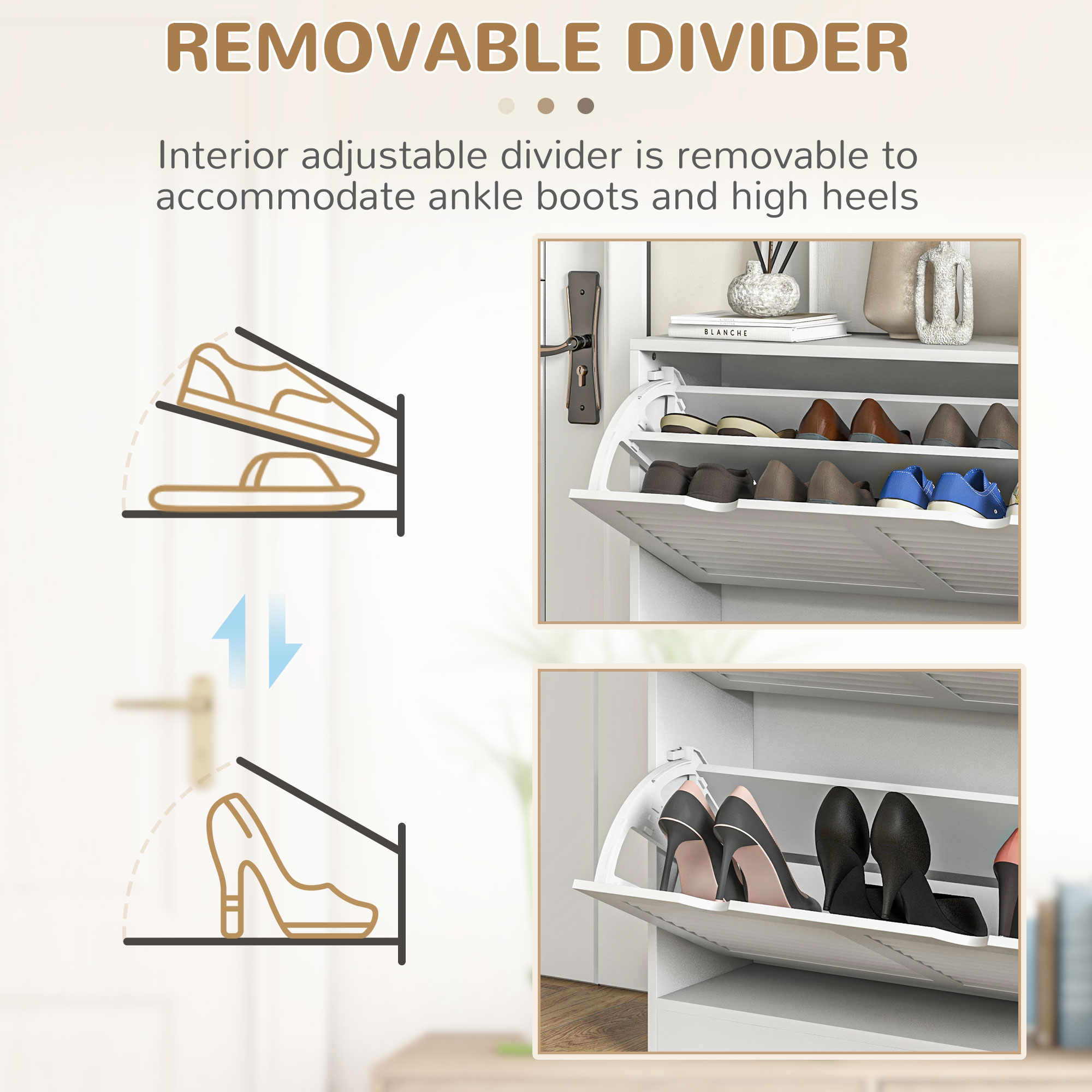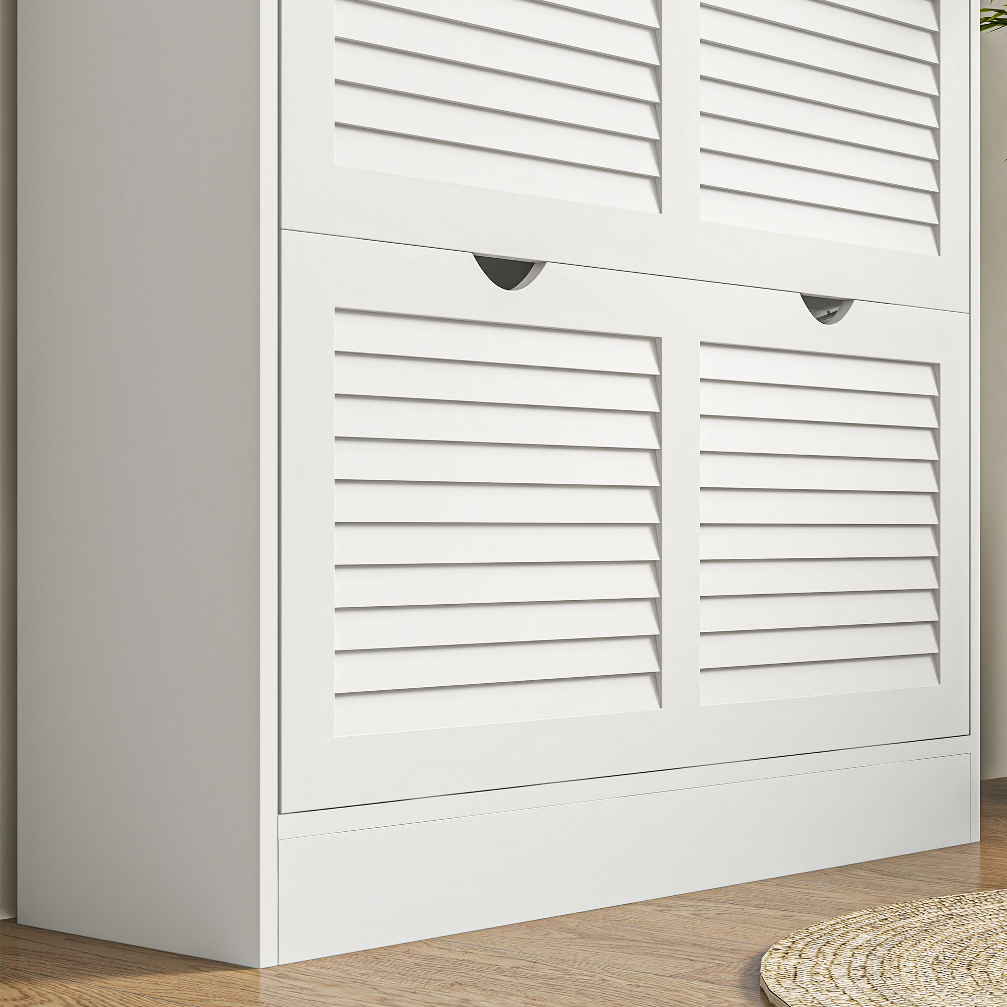 A slim shoe storage cabinet is a must-have for every family, but not all designs cater to your needs. HOMCOM's narrow shoe cabinet is thoughtfully crafted for small entryways, featuring two flip louvered doors with adjustable shelves to accommodate shoes of various sizes. The countertop provides space to display your favourite decorations, while the anti-tipping design ensures safety for homes.