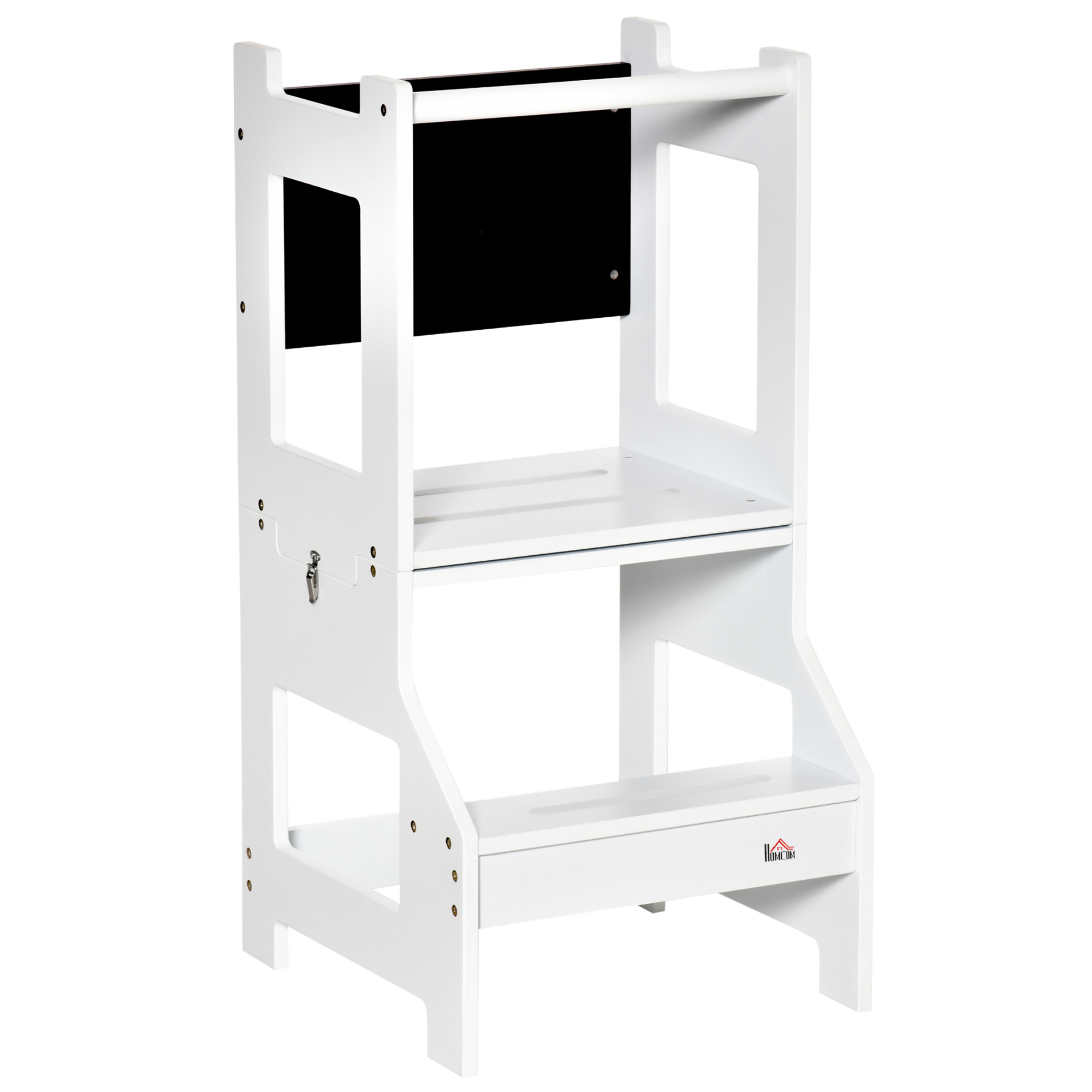 Introduce your child to a world of independence and creativity with the HOMCOM toddler kitchen stool. Designed for children aged 3 to 6, this multifunctional piece allows little ones to safely reach sinks and countertops, fostering participation in family activities like cooking and cleaning. With secure guardrails and handrails, parents can rest assured of their child's safety. Transforming into a desk and chair with a simple lock release, it offers a perfect spot for play, meals, and learning. The included chalkboard inspires artistic expression, making it an ideal choice for nurturing self-reliance and imagination.