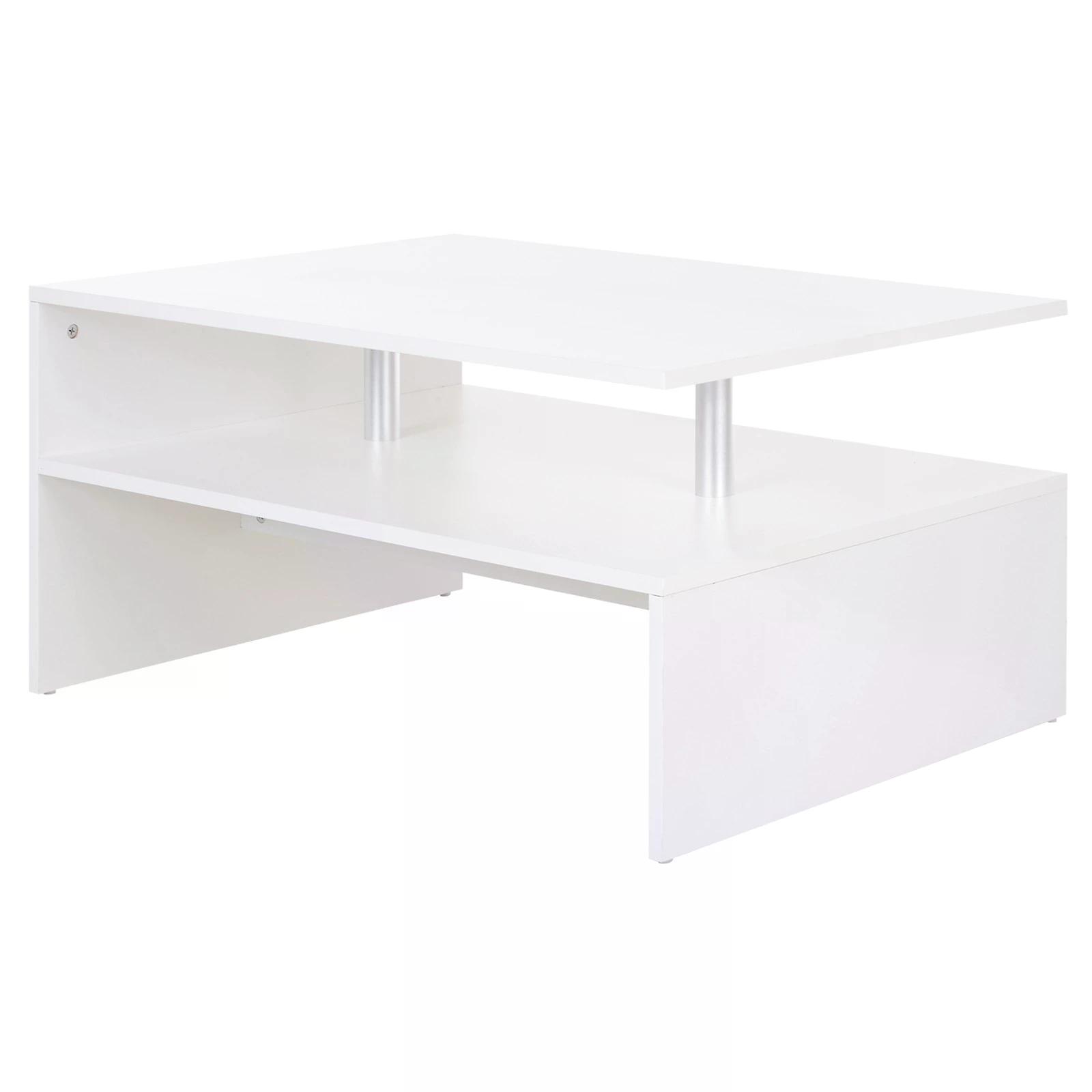Take the modern approach this season to storage and display with this coffee table from HOMCOM. Using particle board for the main body to withstand every day use. It is crafted into a two-tier design, allowing you to discreetly store anything you want out of sight on the bottom shelf, with two aluminum cylinders for additional support. Covered with a melamine surface which is resistant against light water and scratch damage, this piece is completed with four feet for balance.