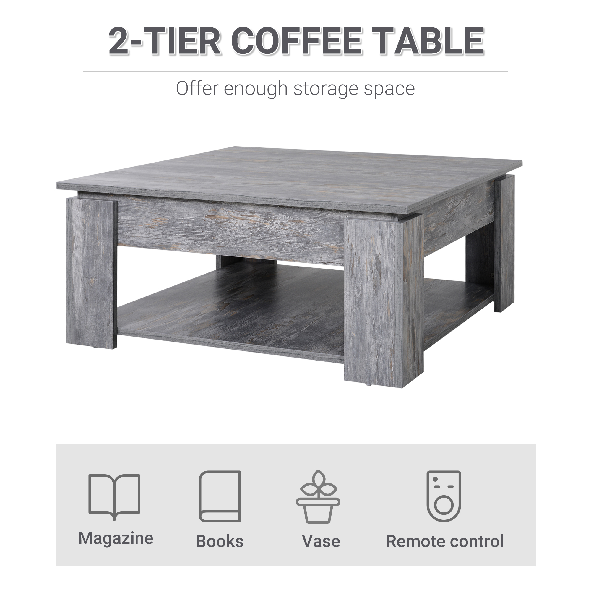 Enjoy relaxing indoor time with this gorgeous faux wood living room coffee table from HOMCOM. Constructed from solid particle board with treated finish, this table is scratch and stain resistant and can hold up to 60kg. The 2 tier design offers additional storage space to hold books, magazines, movies, games, food, drinks, and more. Featuring a beautiful wood grain finish, this versatile coffee table is sure to be a stylish addition to any room of the home.