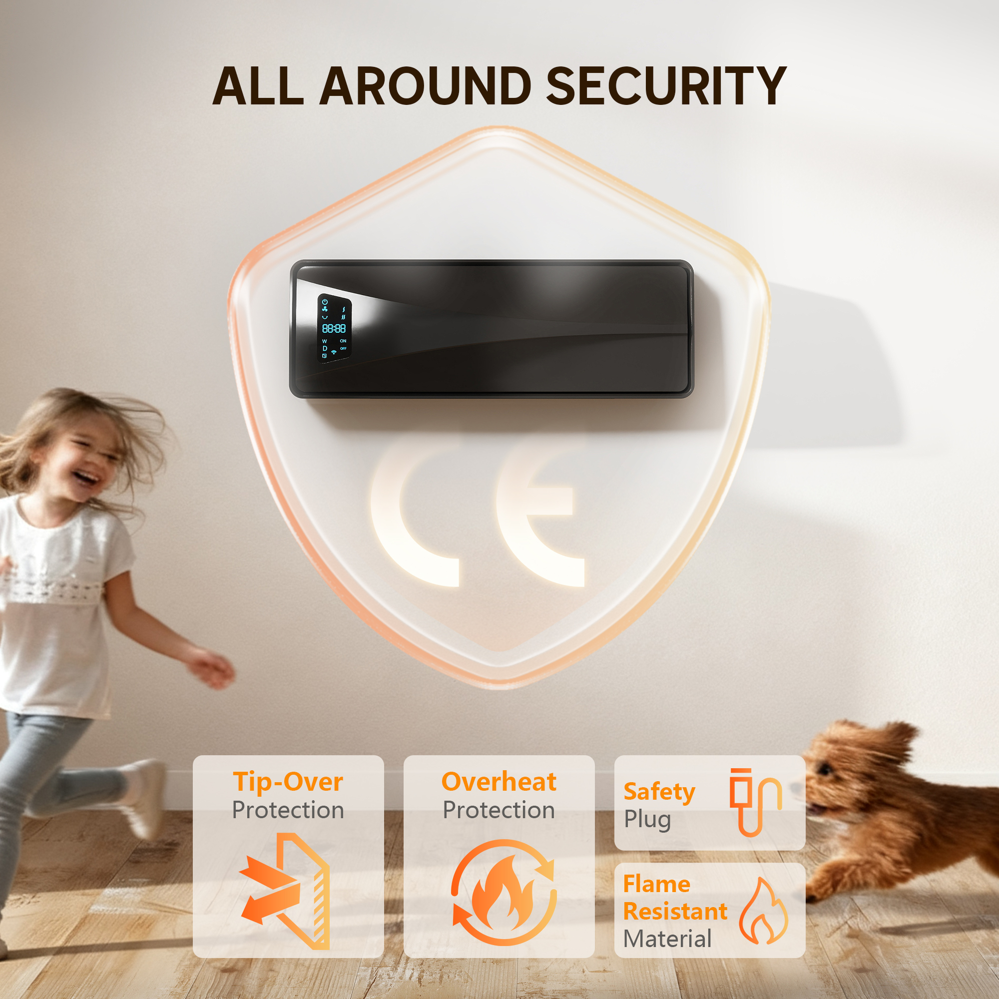 - Built with overheat protection, IP23 waterproofing, high-temperature resistant material, a safety plug and children lock for your family's complete safety