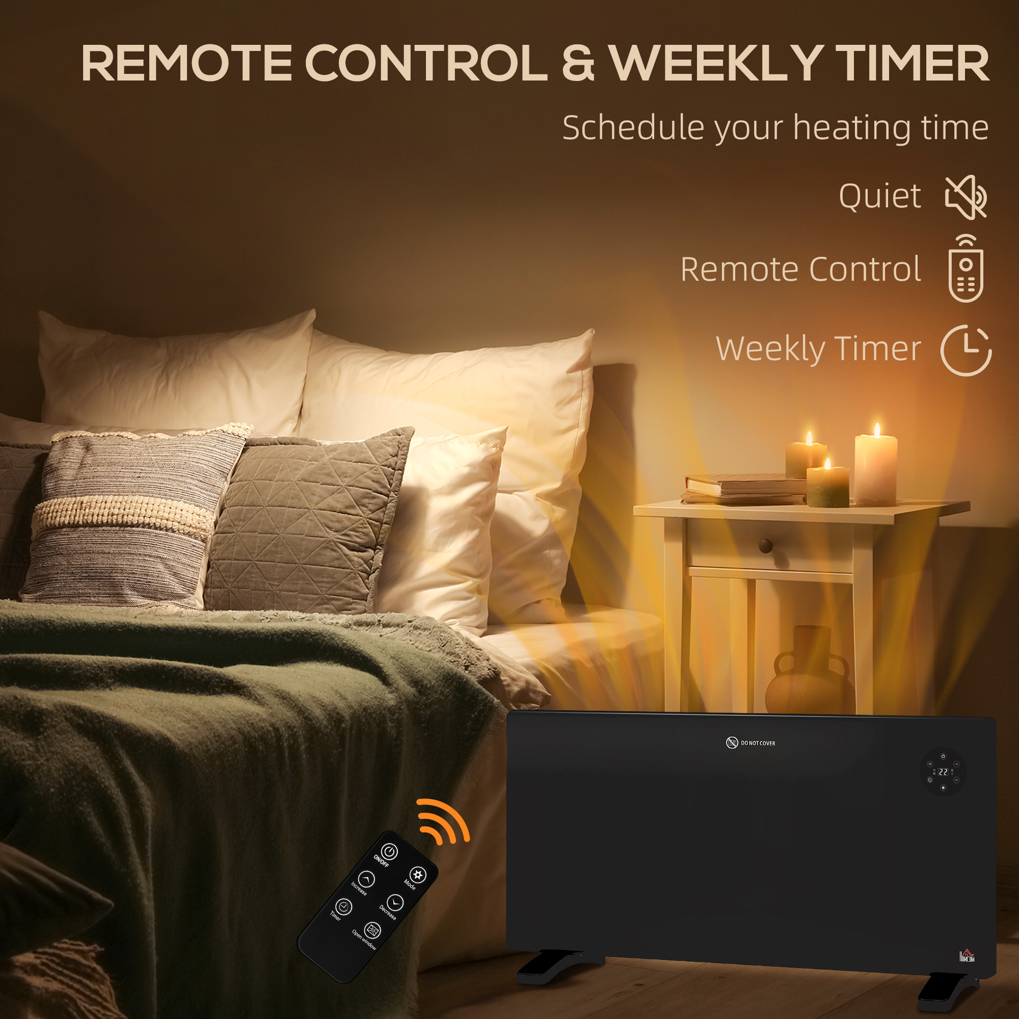 - Weekly timer allows you to schedule your heating time