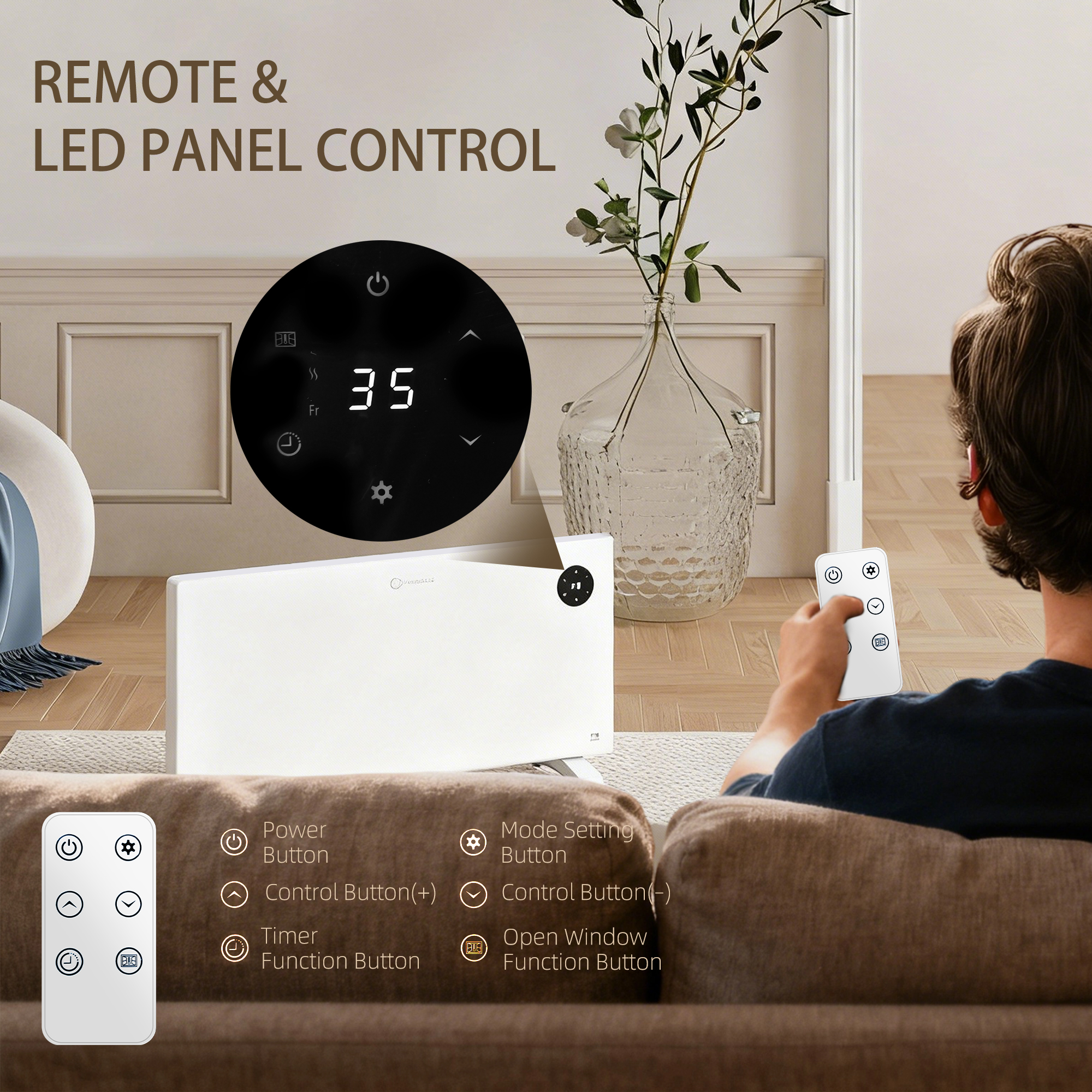Encased in a cool design, yet gives you plenty of heat - this HOMCOM small heater will keep you warm all evening long. Slimline build, in a netural colour makes is modern and sleek; leave it standing or fix to the wall. Freely adjust the temperature between 5-35℃; with aluminium heating, it'll heat to your desired temperature quickly. View and adjust this space heater with the LED screen. Complete with overheat protection for safety. Remote included.