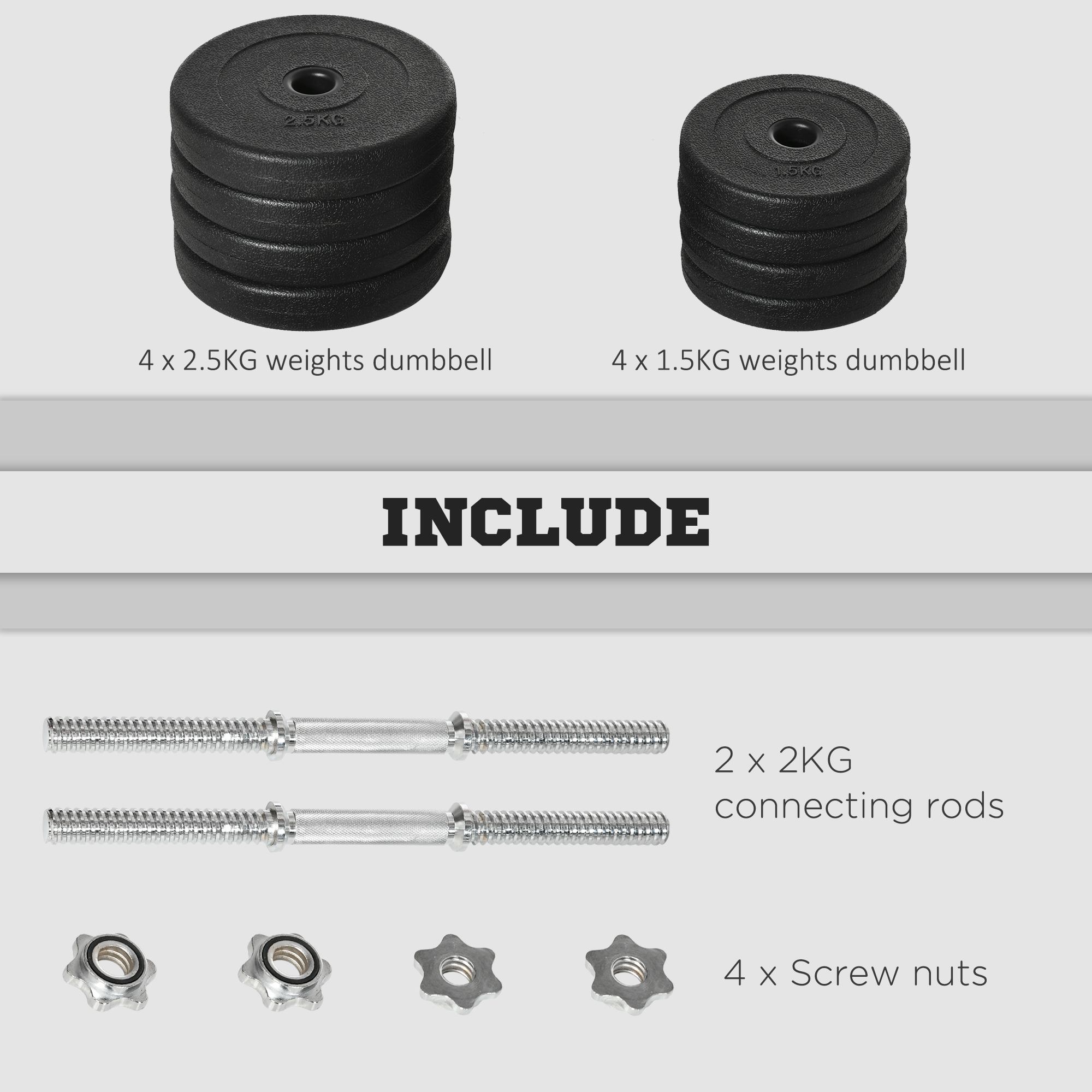 This dumbbell set comes with different weight plates and chrome finish bar, so it's easy to adjust to your most desirable weight. Comes with 4 x 2.5kg and 4 x 1.5kg weights, as well as 2 x 2kg connecting rods. You can easily exercise your arms, shoulders and back, strengthening your muscles and toning your body. It can be stacked together when not in use to save space. A gym weights set suitable for home and office use.