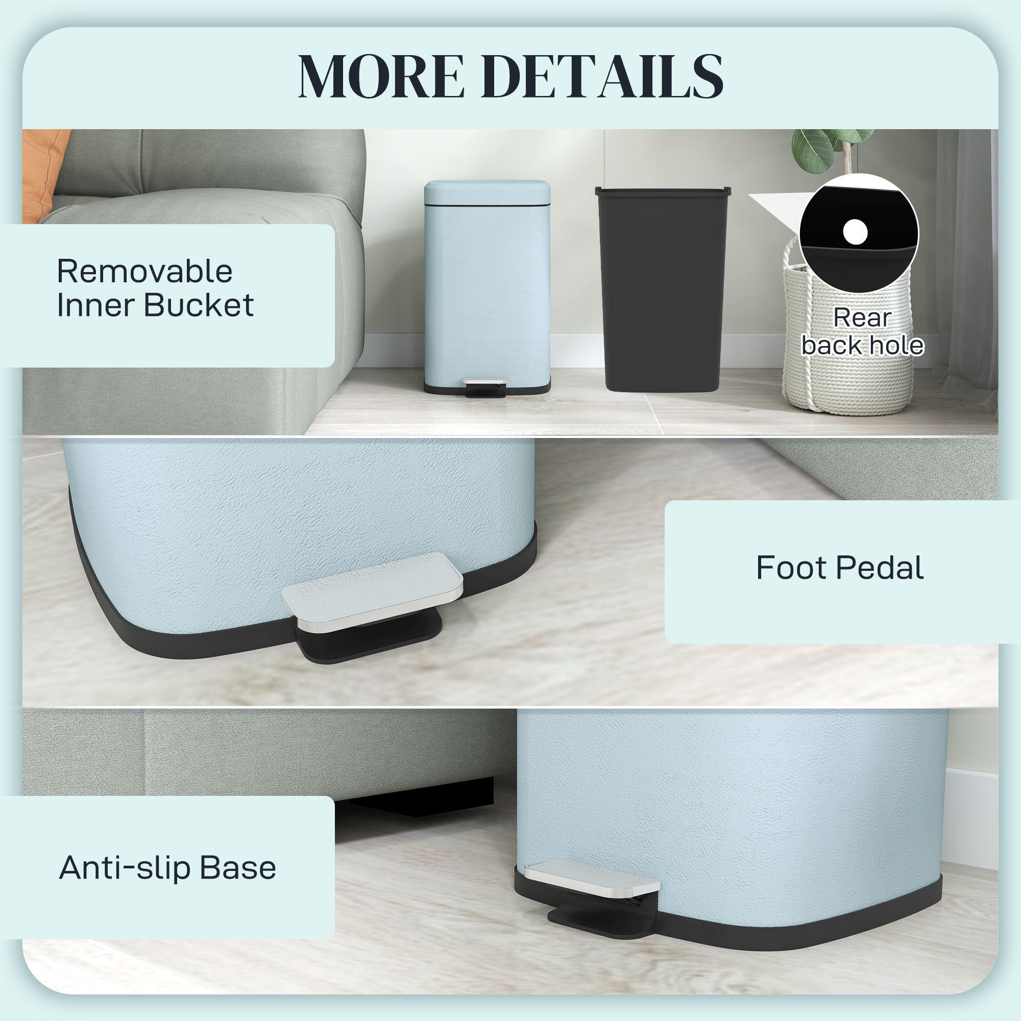 - Removable bucket design, with a hole to fix bin bag for easy cleaning