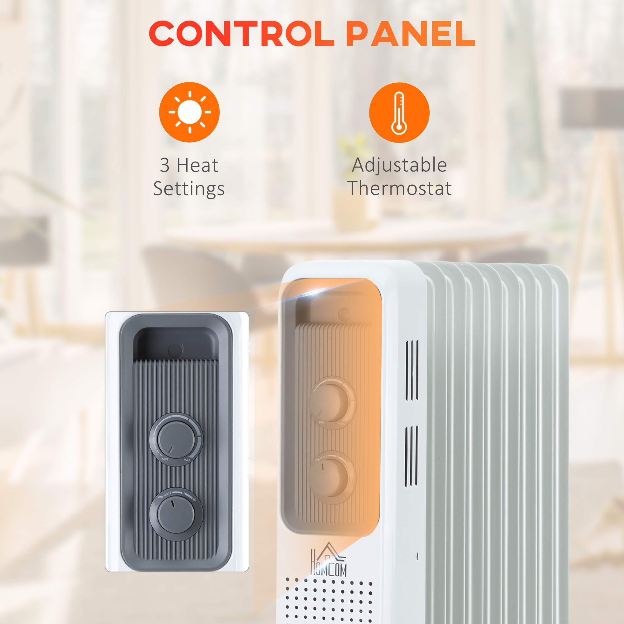 Keep warm with this oil filled radiator from HOMCOM. With an adjustable temperature of 7-35℃ and three heating modes, you're in control of the heat you want. The overheating and tip-over function will turn it off safely, so you can enjoy this portable radiator with peace of mind. Move with minimum fuss using the wheels and handle, making sure no room goes cold. It's complete with a cable organizer for tidiness. Get a cosy winter by HOMCOM electric radiator.
