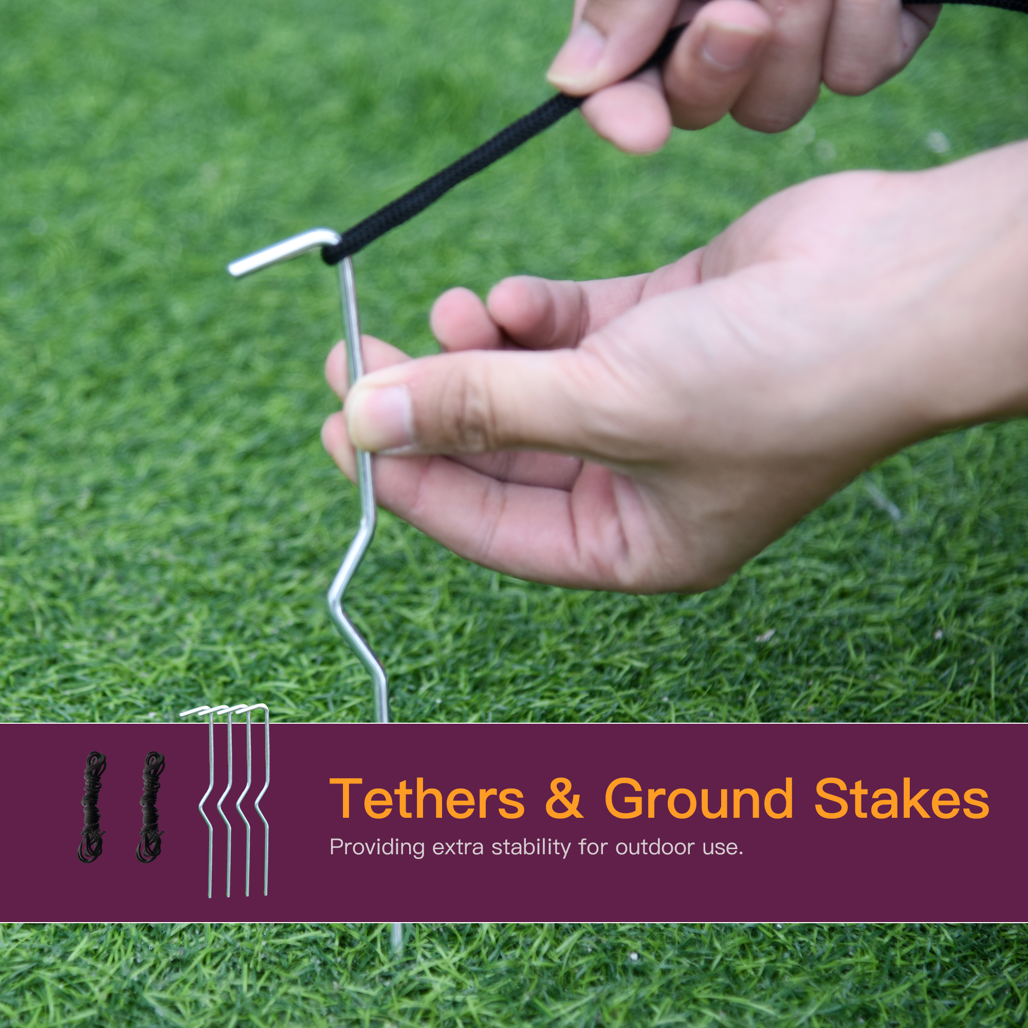 - Seven ground stakes, five strings, an inflator fan and two sandbags are included