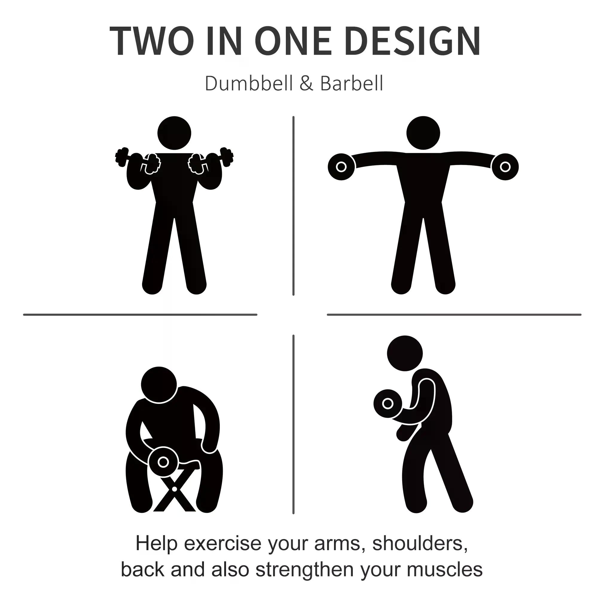 Elevate your fitness journey with the versatile HOMCOM two-in-one dumbbell set, designed for those passionate about strength training. Seamlessly switch between dumbbells and a barbell to diversify your workouts at home. With 12 plates and 3 rods, customize the weight to match your fitness level, whether you're a beginner or an expert. Perfect for a range of exercises, from bicep curls to squats, this set empowers you to achieve your fitness goals with ease and precision.